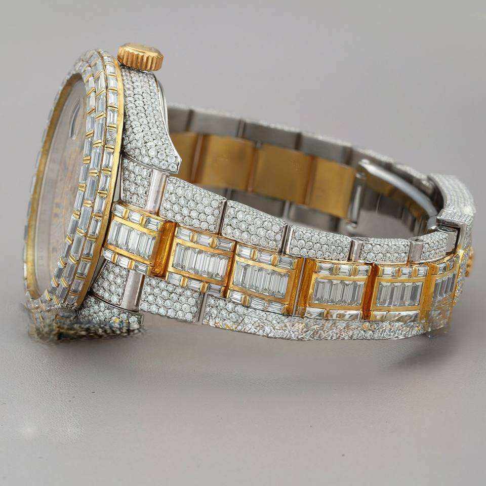 นาฬิกาควอตซ์หรูหราประดับเพชรโมอิสซาไนต์เต็มหน้าปัด ขนาด 40 มม. ดีไซน์ธุรกิจ กระจกสองสี กรอบเพชรทรงบาแกตต์ ระบบ GMT สไตล์ฮิปฮอป ดูเหมือนเพชร ตัวเรือนสแตนเลสสตีล