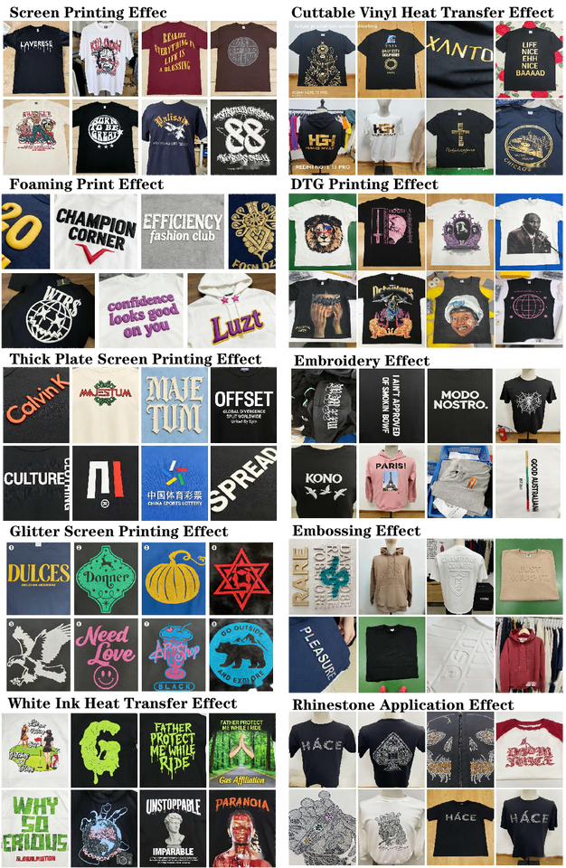Puff Printing, Embossed, Heat-Transfer Printing, Digital Printing, Silk Screen Printing, Ready-Made Apparel Direct Injection Heat-Transfer Printing, Ready-Made Apparel Direct Digital Printing, Sublimation Transfer Print, silicone printing, Crack printing, HD print, Customized Design