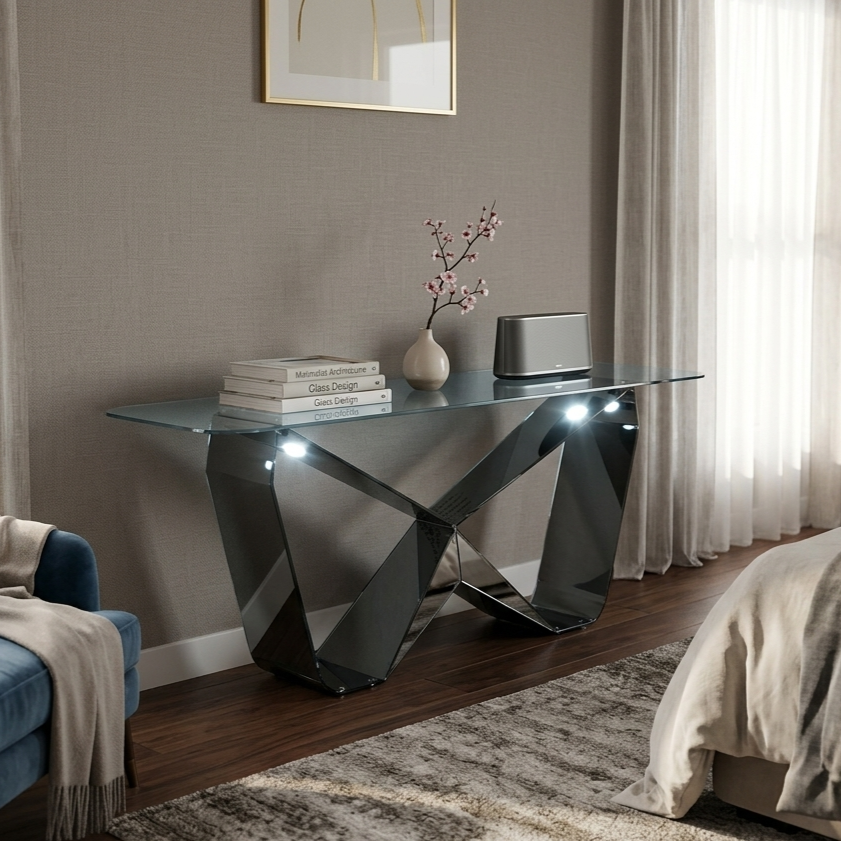 โต๊ะกาแฟกลางห้องกระจกหรูหราพร้อมโครงโลหะศิลปะและดีไซน์ร่วมสมัย