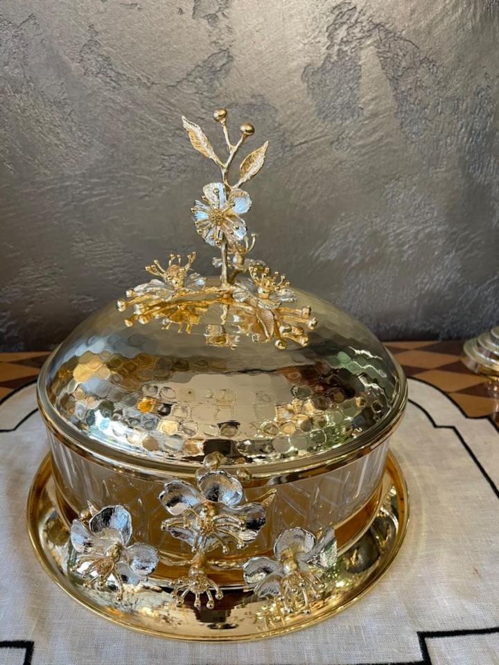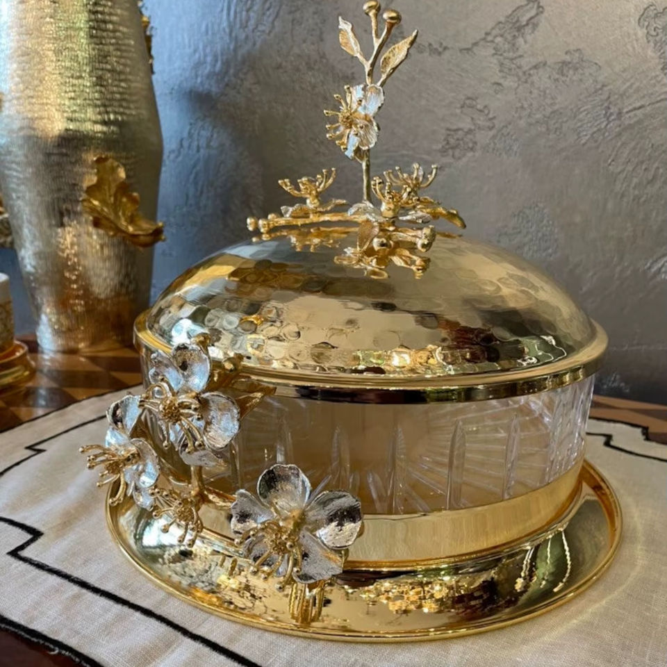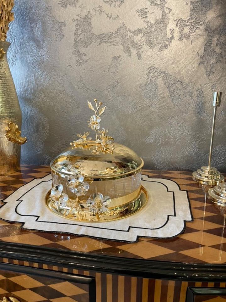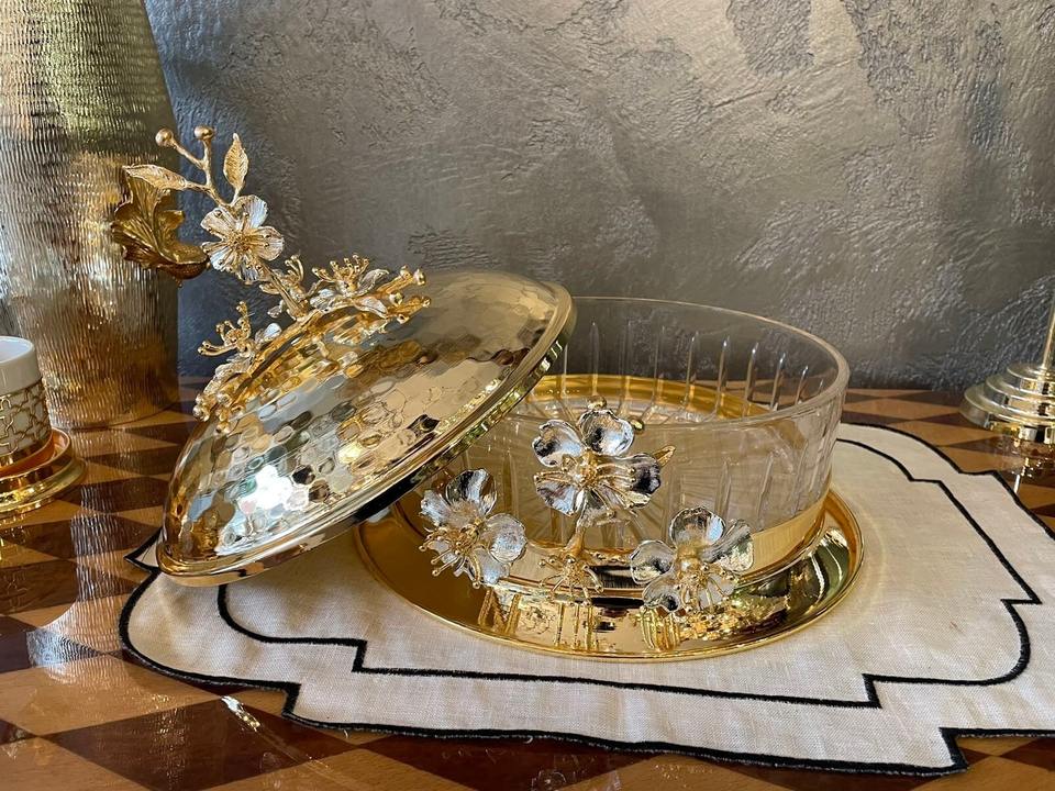 ชามแก้วใส่ช็อกโกแลตสุดหรู พร้อมฝาปิดลายดอกไม้สีทอง สำหรับจัดแสดงช็อกโกแลตที่บ้าน ใช้เสิร์ฟแขก และใส่ผลไม้อบแห้งในช่วงเทศกาล