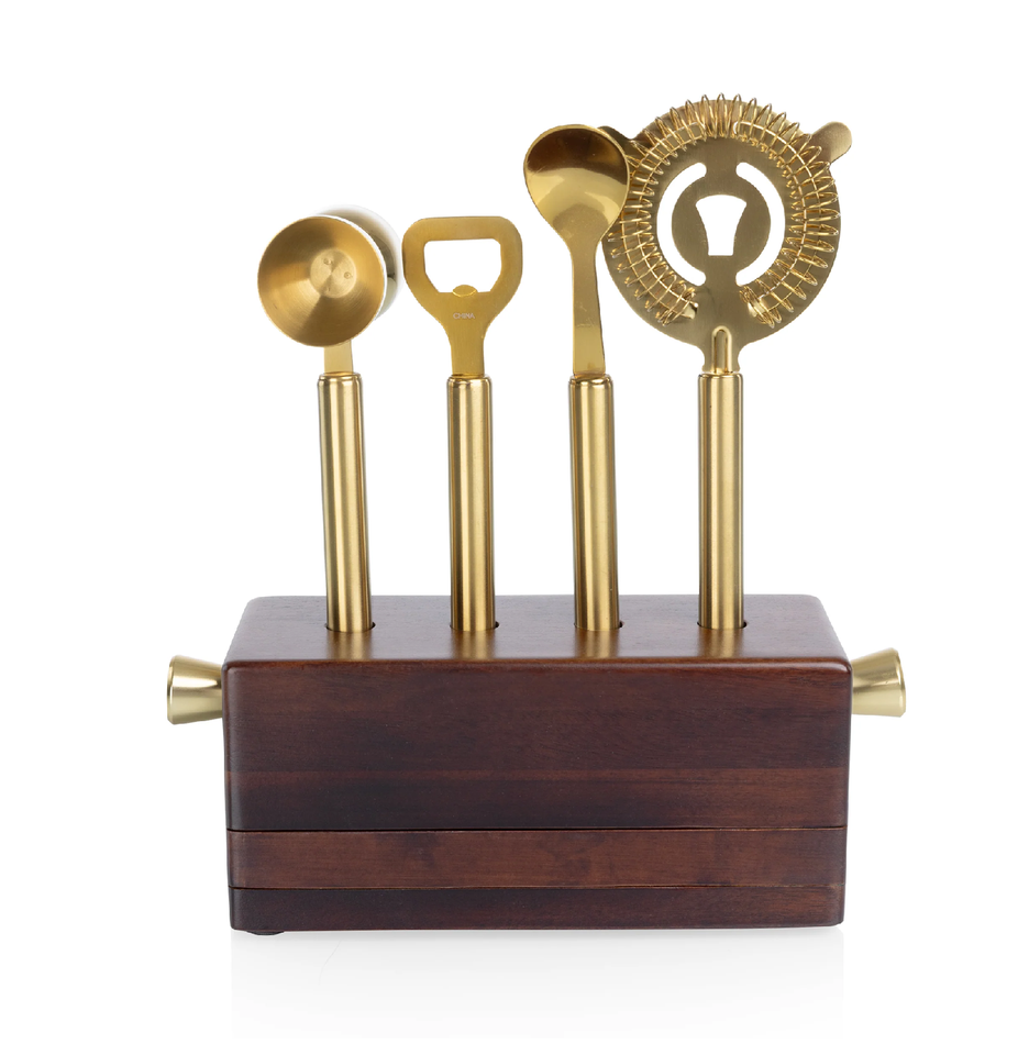 ชุดเครื่องมือบาร์ทองเหลืองหรูหรา สำหรับใช้ในโรงแรมและเคาน์เตอร์บาร์สุดหรู พร้อมอุปกรณ์เสริมบาร์ทองเหลืองและฐานไม้