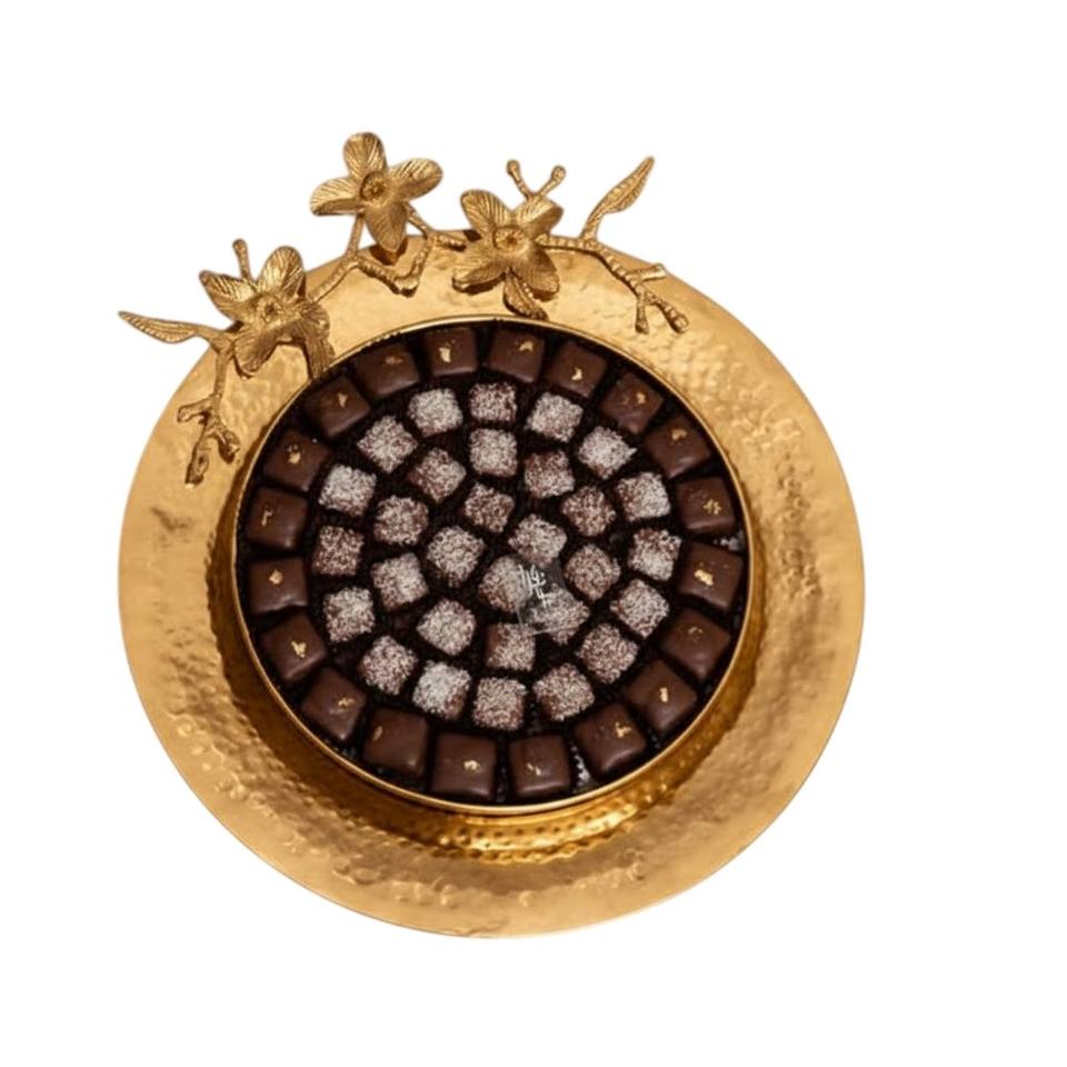 ถาดช็อกโกแลตทองคำหรูหราพร้อมลายดอกไม้ ถาดเสิร์ฟโลหะตกแต่งสวยงาม เหมาะสำหรับงานแต่งงาน อีด และรอมฎอน