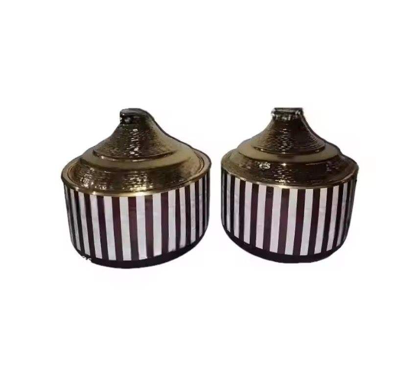 ถาดอุ่นอาหารบุฟเฟ่ต์สแตนเลสสตีลตกแต่งทองหรูหรา พร้อมฝาครอบทรงโดม สำหรับจัดเลี้ยง