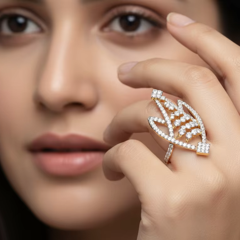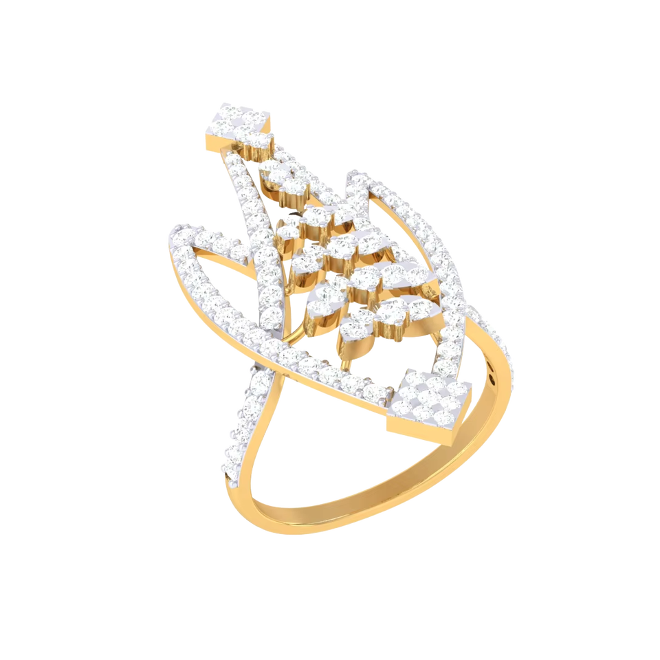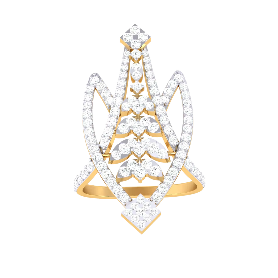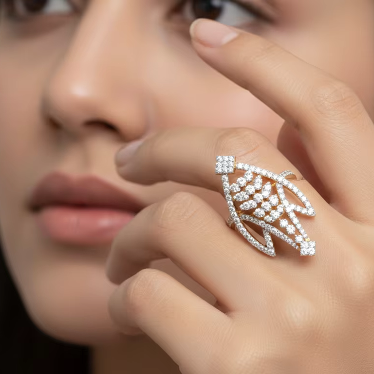 แหวนค็อกเทลเพชรทองคำขาวหรูหราสำหรับผู้หญิง ดีไซน์รูปทรงเรขาคณิตรูปตัววี แหวนแต่งงานหมั้นดีไซน์เฉพาะตัว