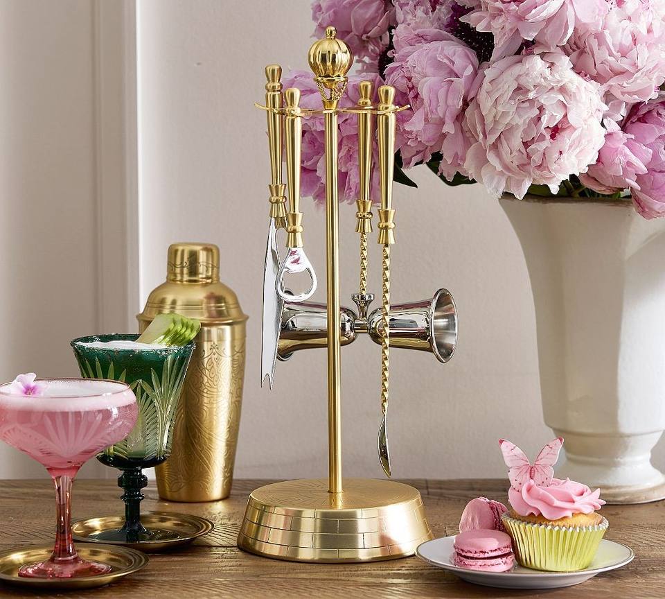 ชุดเครื่องมือบาร์เคลือบทองหรูหรา พร้อมที่วางตั้ง อุปกรณ์ทำค็อกเทลระดับมืออาชีพ ตกแต่งบาร์บ้านอย่างมีสไตล์