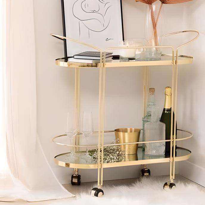 รถเข็นบาร์เหล็กเคลือบทองหรูหรา พร้อมชั้นวางแก้ว รถเข็นเสิร์ฟแบบมีล้อ สำหรับใช้ในบ้าน ห้องครัว ห้องรับประทานอาหาร เก็บเครื่องดื่ม บ้าน โรงแรม