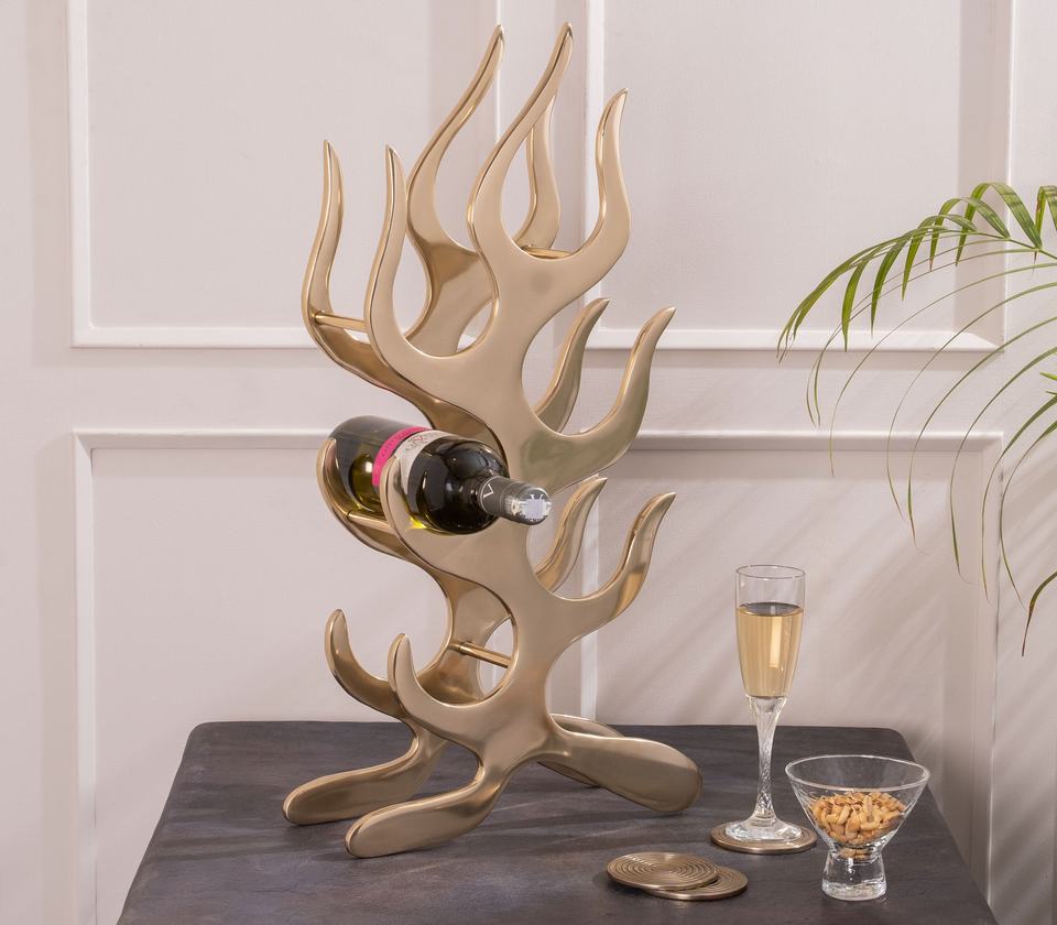 ชั้นวางไวน์ลายเปลวไฟสีทองสุดหรู | ที่วางขวดไวน์โลหะดีไซน์ศิลปะ ที่วางขวดไวน์แบบตั้งโต๊ะทันสมัย