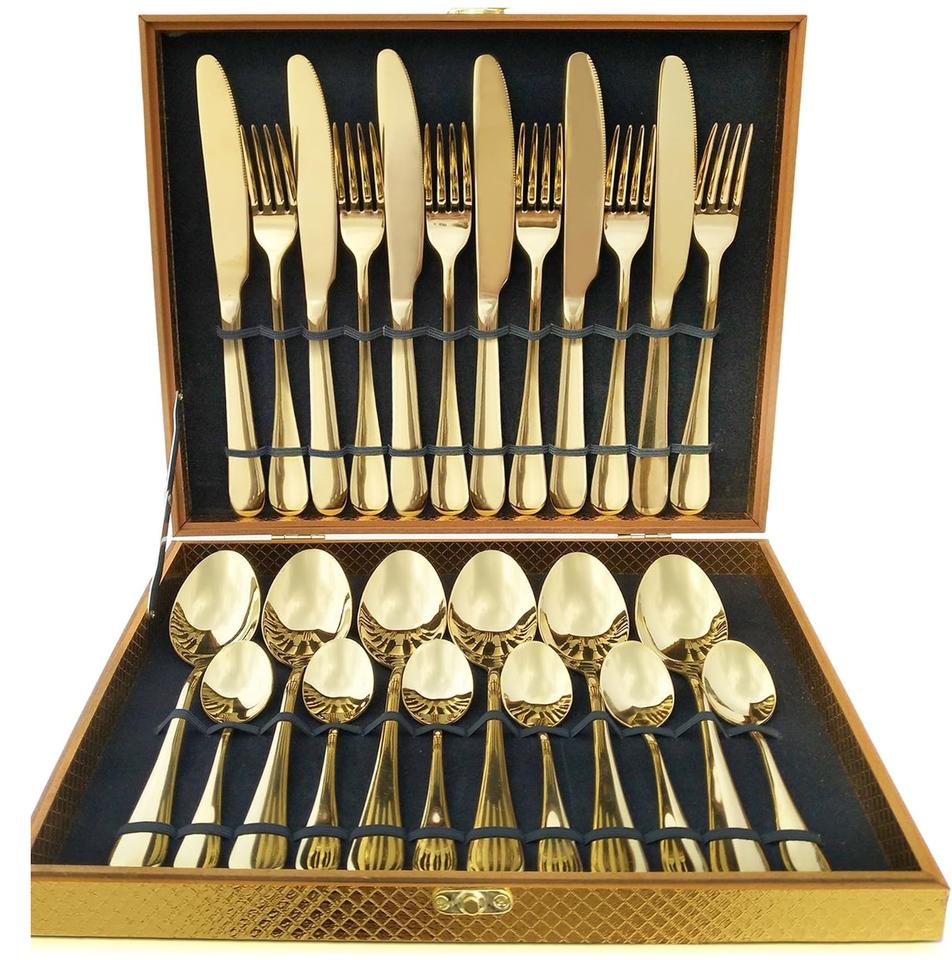 ชุดช้อนส้อมทองหรูหรา 24 ชิ้น ชุดช้อนส้อมสแตนเลสพร้อมกล่องของขวัญหนังพรีเมียม ชุดช้อนส้อมมีดส้อมขัดเงา