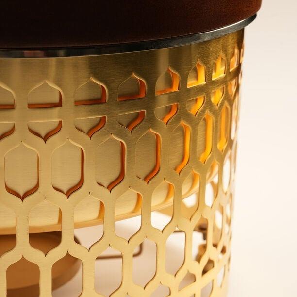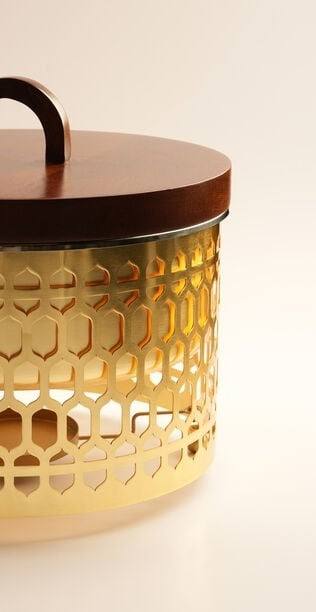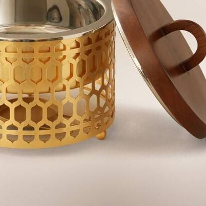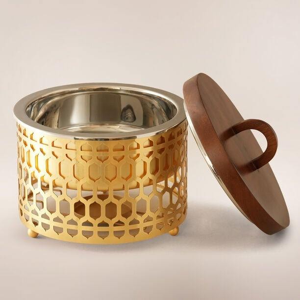 ถาดอุ่นอาหารทรงกลมสแตนเลสสตีลลายเรขาคณิตสีทองหรูหรา พร้อมฝาไม้วอลนัท สำหรับรอมฎอน โรงแรม บุฟเฟ่ต์