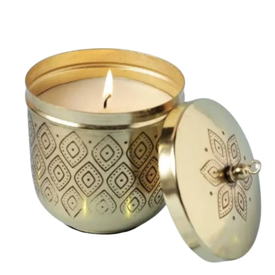กระปุกเทียนโลหะลายตอกสีทองหรูหรา พร้อมฝาปิดตกแต่งสวยงาม ของตกแต่งบ้านสุดหรู ภาชนะใส่เทียนหอม ของขวัญสำหรับเทศกาลและงานแต่งงาน