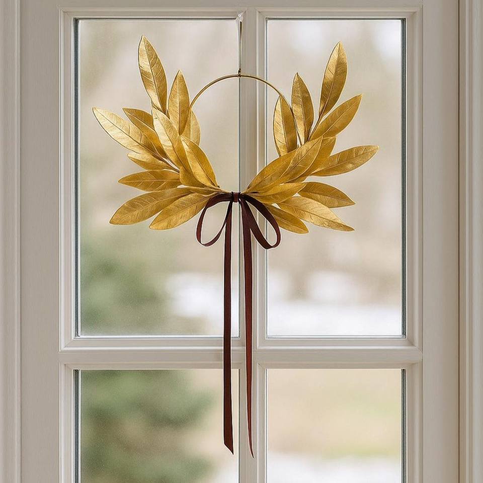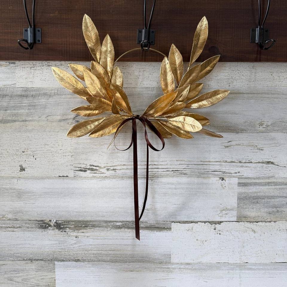 พวงหรีดกิ่งมะกอกโลหะสีทองหรูหราพร้อมริบบิ้น ตกแต่งผนังด้วยทองเหลืองอย่างสวยงาม สำหรับตกแต่งบ้านสไตล์ยุโรปในเทศกาลคริสต์มาส