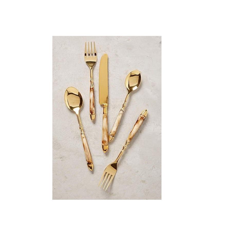 ชุดเครื่องใช้บนโต๊ะอาหารขัดเงาสีทองสุดหรูพร้อมที่จับโลหะทำจากสเตนเลสสตีล5ชิ้นสำหรับงานแต่งงานและงานรับประทานอาหาร