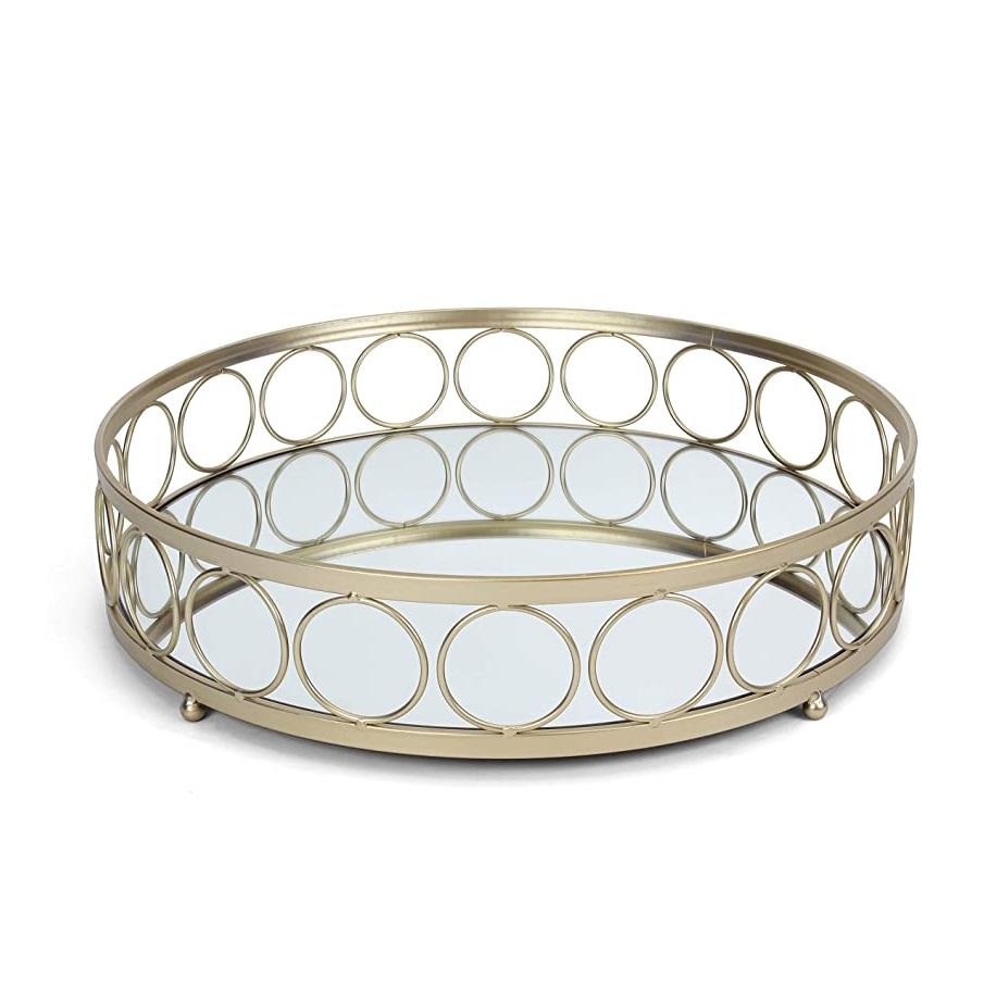 ถาดกระจกสีทองหรูหรา ถาดโลหะทรงกลมสำหรับตกแต่งโต๊ะเครื่องแป้ง ถาดแก้วประดับตกแต่งสำหรับเก็บเครื่องประดับและเสิร์ฟอาหาร สำหรับตกแต่งบ้าน