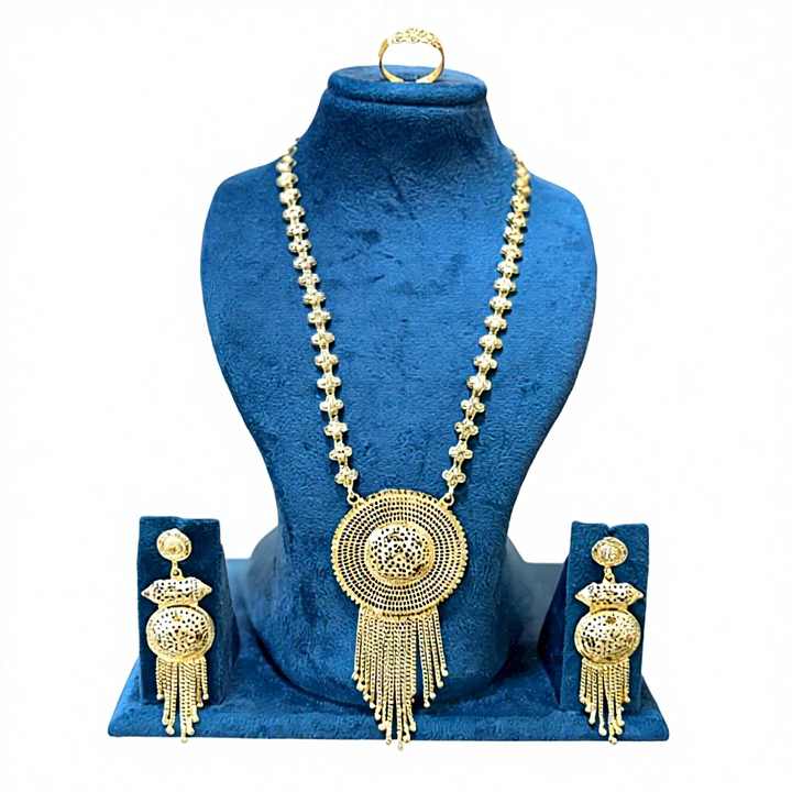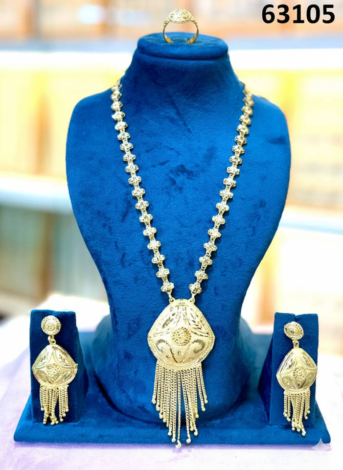 ชุดสร้อยคอยาวชุบทองหรูหรา พร้อมจี้ดีไซน์เนอร์และต่างหูพู่ห้อย สำหรับงานแต่งงาน รุ่น 63104