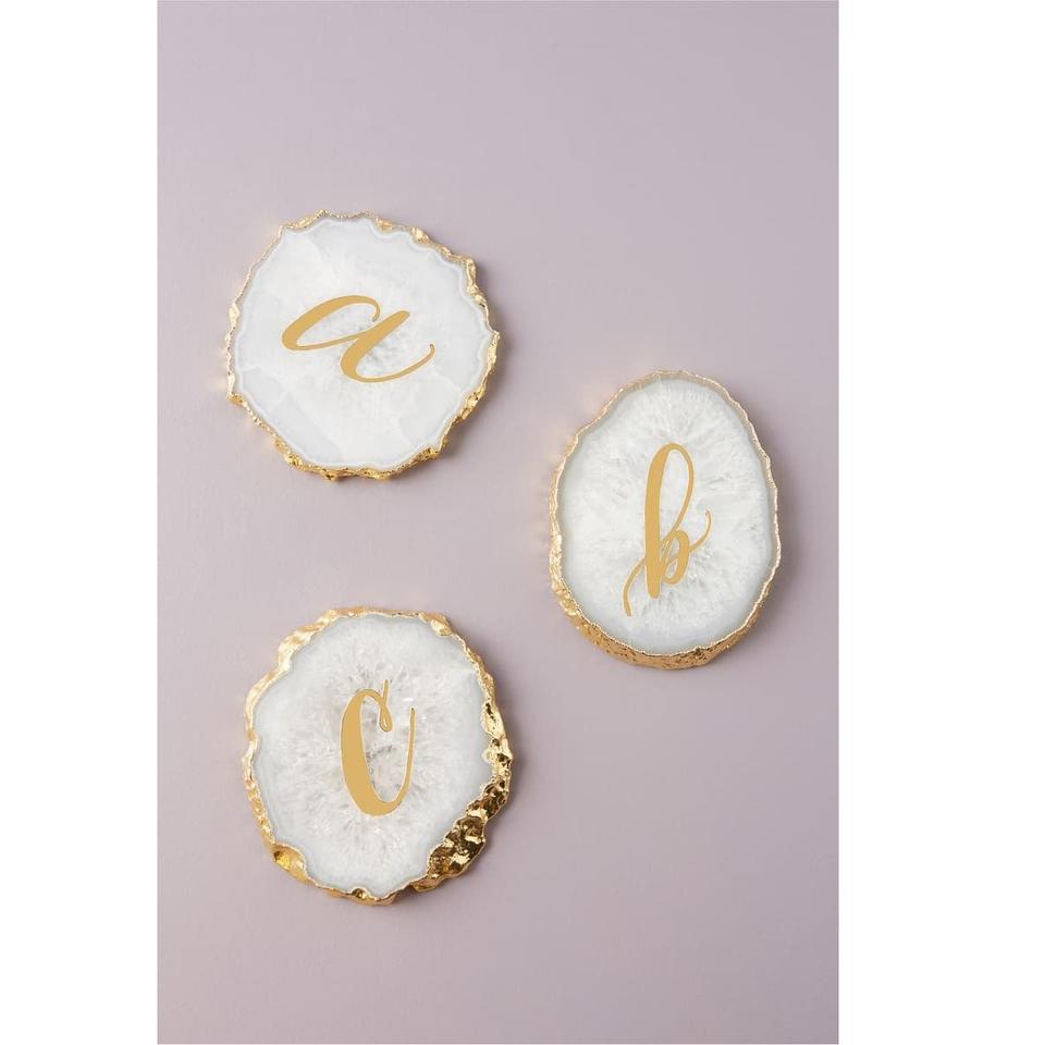 ชุดจานรองแก้วไม้สีขาวขอบทองหรูหรา คุณภาพสูง สำหรับงานแต่งงาน ตกแต่งบ้าน จานรองแก้วหินสลักอักษรย่อ/ชื่อย่อตามสั่ง ขายส่ง
