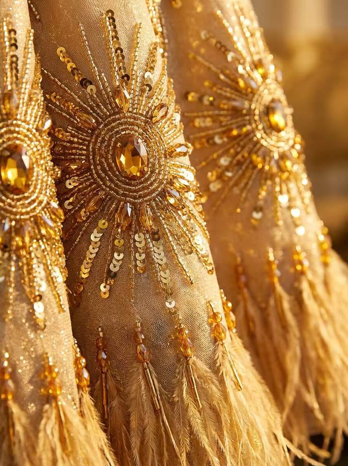 ชุดค็อกเทลหรูหราประดับเลื่อมสีทองสำหรับผู้หญิง ลายซันเบิร์สต์ ชุดราตรีชายกระโปรงแต่งขนนก ขายส่ง ชุดออกงานหรูหรา รับผลิตแบบ OEM/ODM