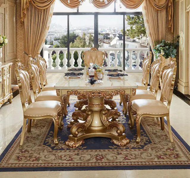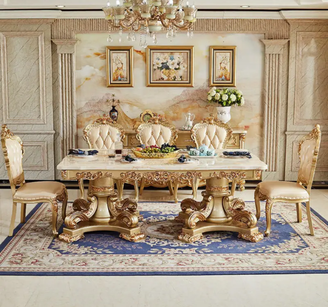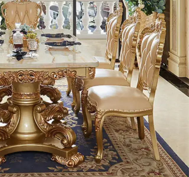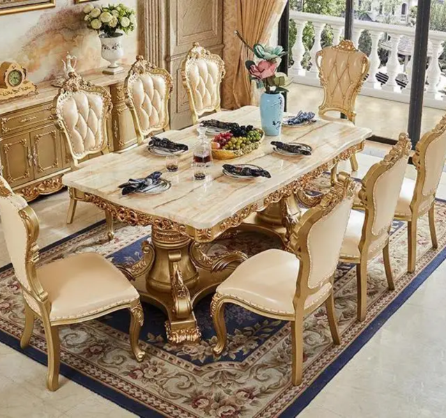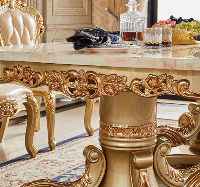 Luxury Gold Solid Teak Wood Marble Top European Carved Dining Table Set for Hotel Use Made in Indonesia