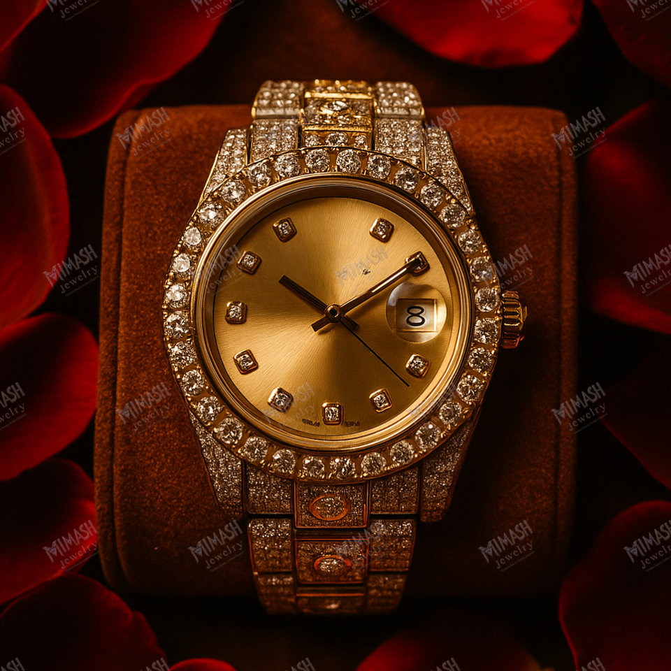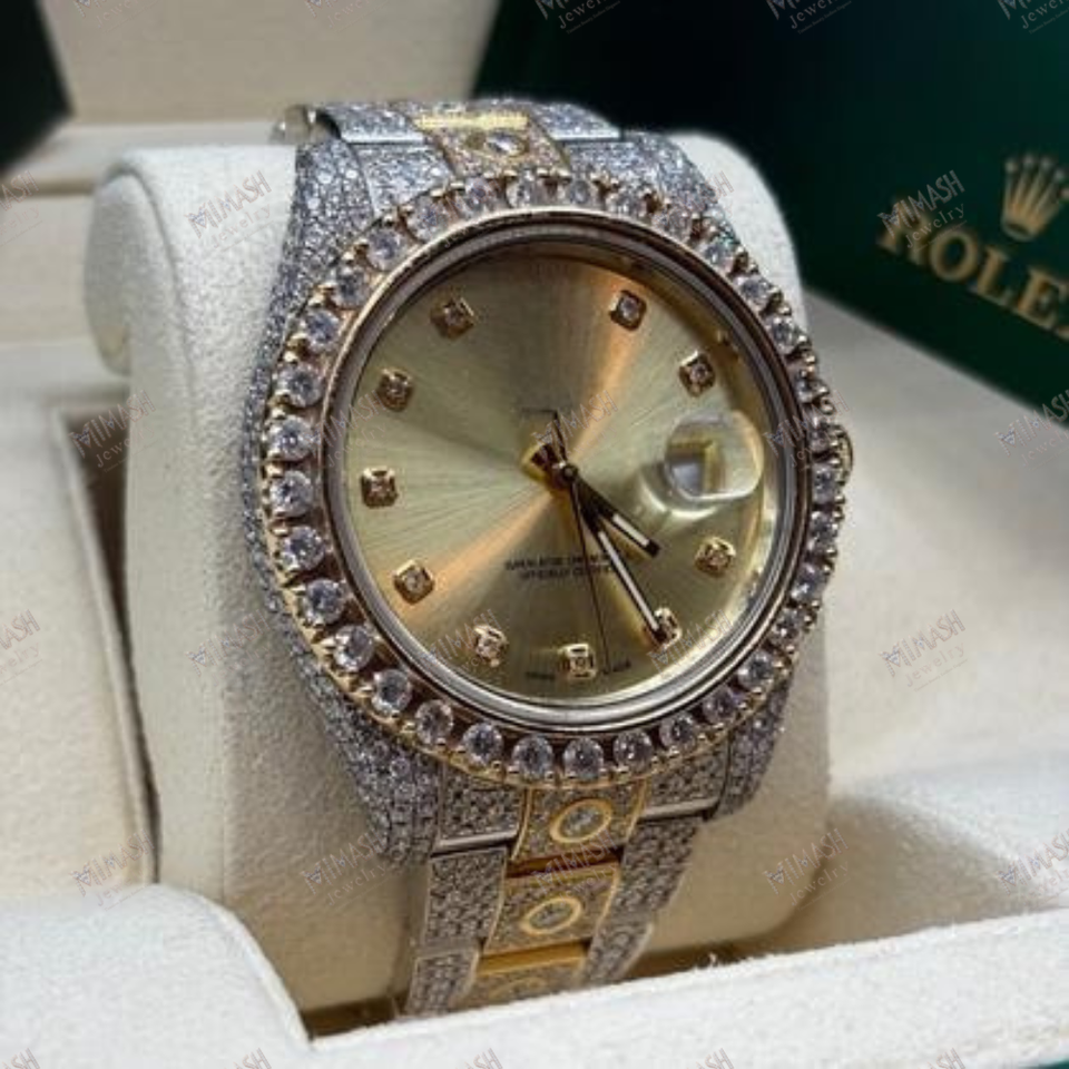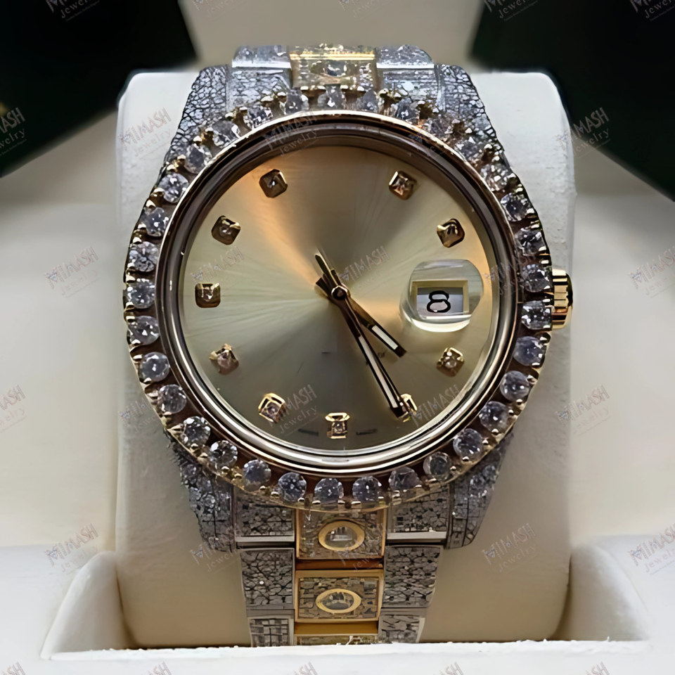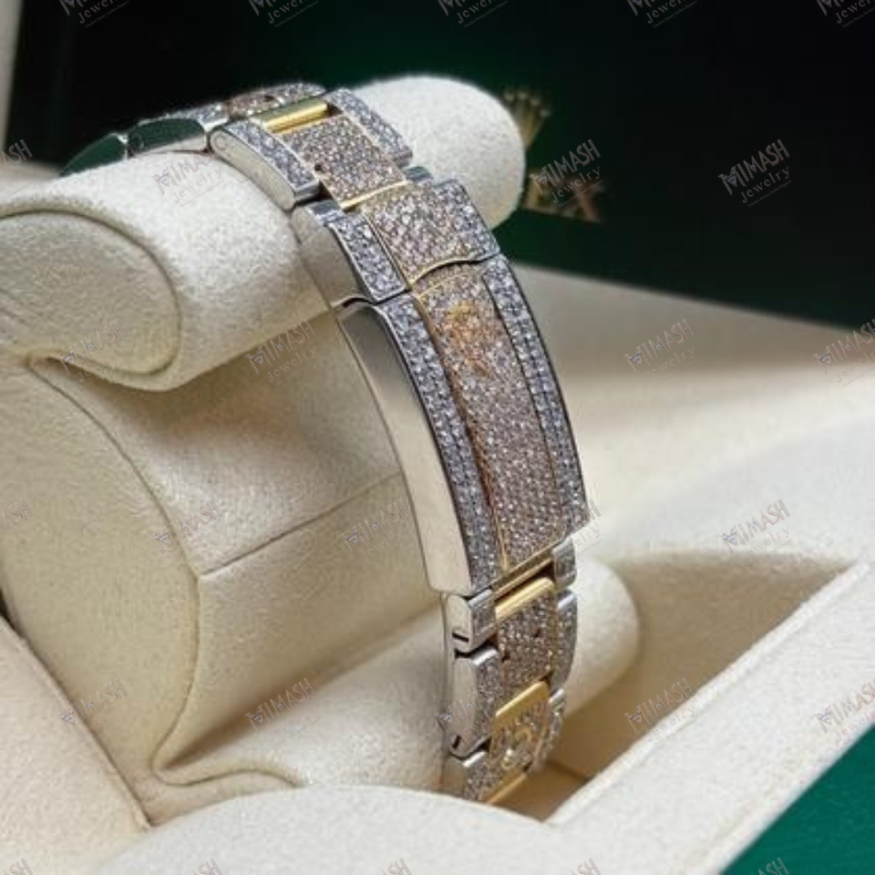 นาฬิกาสีทองสุดหรูพร้อมกรอบเพชรและเครื่องหมายบอกชั่วโมงหน้าปัดตัวหนาแสดงวันที่และสายรัดดีไซเนอร์สองโทนอย่างละเอียด