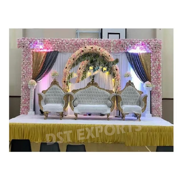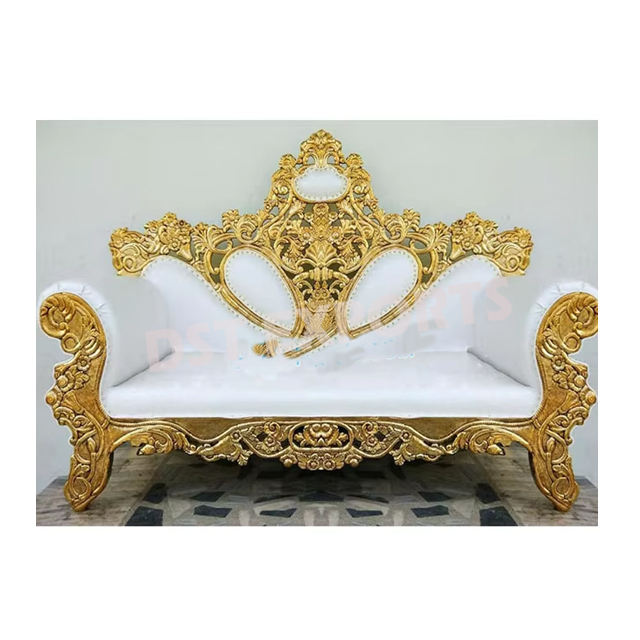 ชุดโซฟาสีทองสุดหรูสำหรับงานแต่งงานชุดโซฟาไม้สำหรับงานแต่งงานเวทีพิธีแต่งงานสไตล์มหาราชา