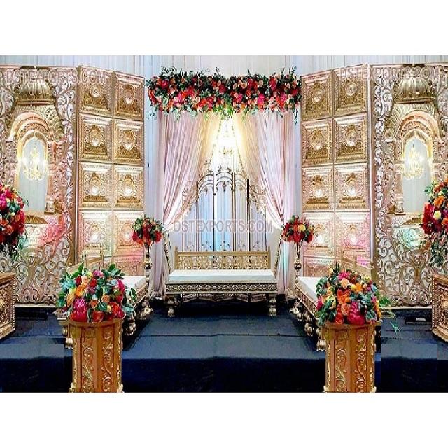 ตกแต่งเวทีงานแต่งสุดหรูสีทองต้อนรับกลางคืนเวทีแต่งงานสีทองฟุ่มเฟือยแถม Mandap ใหญ่อ้วนอินเดียตกแต่งเวทีแต่งงาน