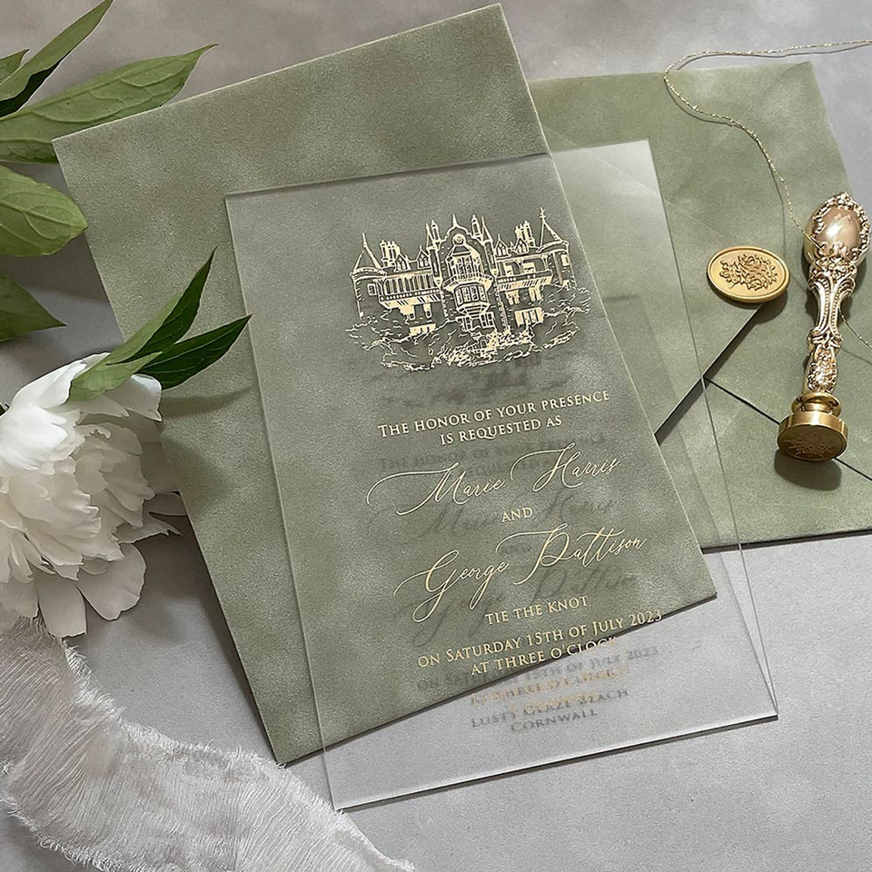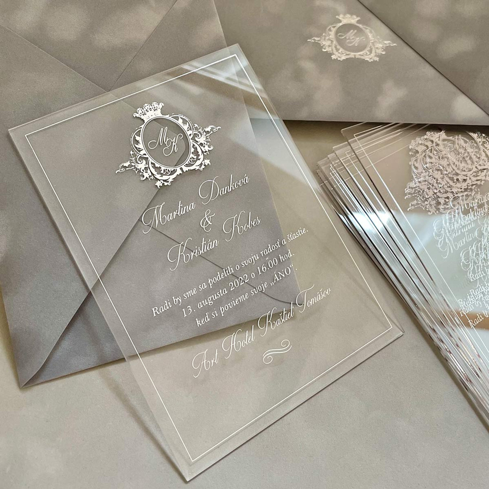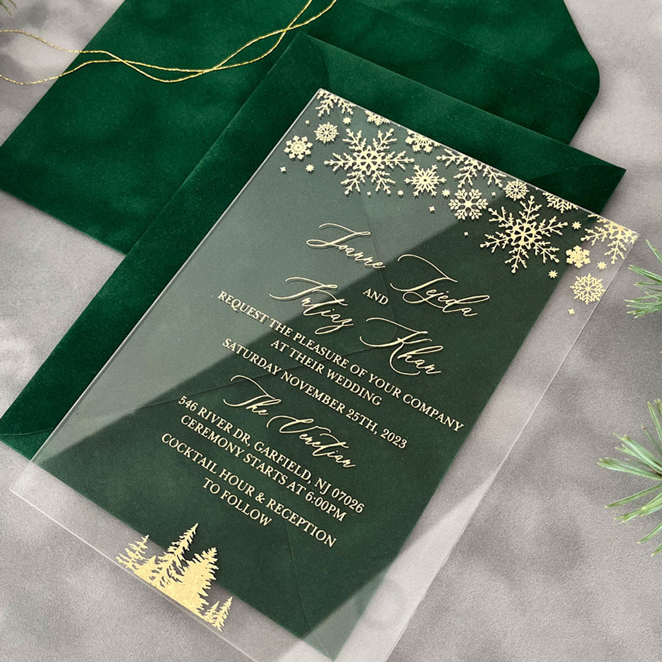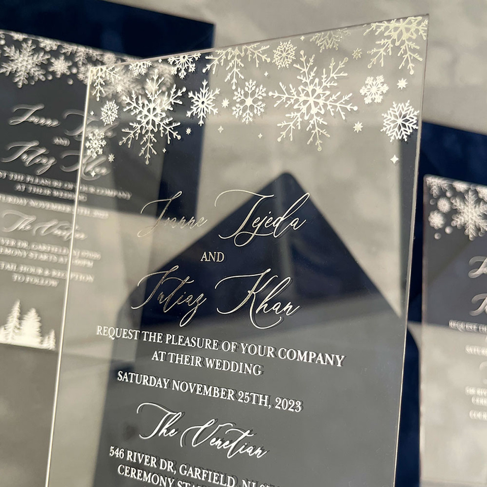 การ์ดเชิญงานแต่งงานแบบอะคริลิคประทับลายฟอยล์สีเงินหรูหราสง่างามพร้อมซองกำมะหยี่