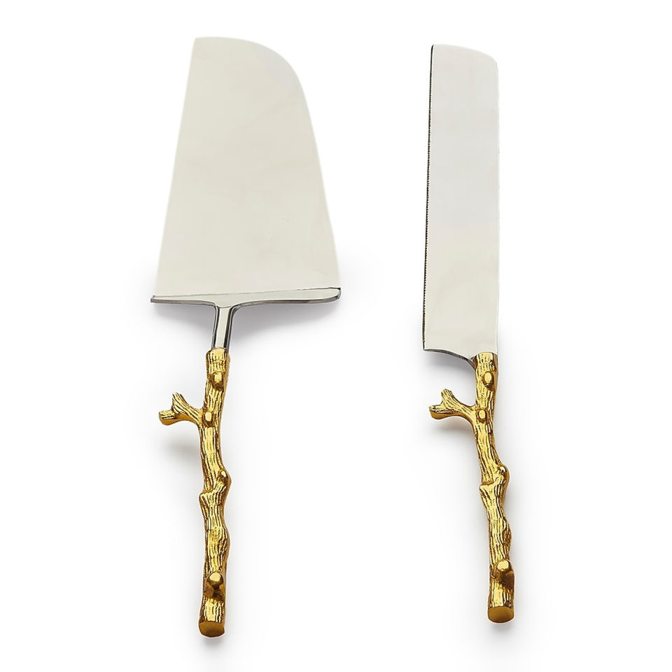 ชุดมีดและเสิร์ฟเค้กโลหะสุดหรูใบมีดชุบเงินพร้อมที่จับรูปกิ่งไม้หนาชุบทอง