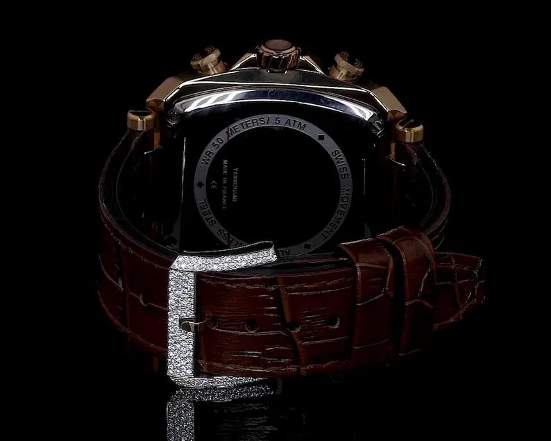 นาฬิกาผู้ชายโครโนกราฟหน้าปัดเพชรหรูหราสีเขียวประดับด้วยเม็ดเพชรสีโรสโกลด์