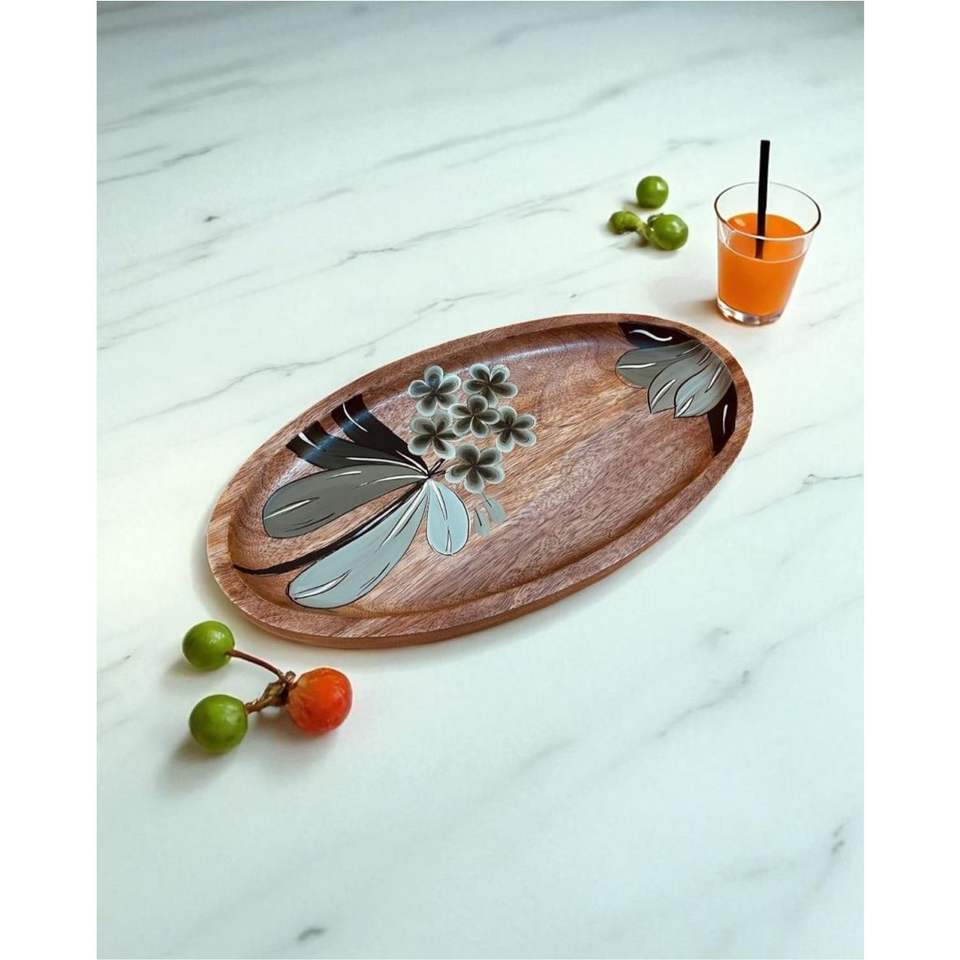 ถาดไม้มะม่วงทรงรีตกแต่งลายดอกไม้สีเขียวเคลือบเงาอย่างหรูหรา | ถาดเสิร์ฟสไตล์โมเดิร์นฟาร์มเฮาส์