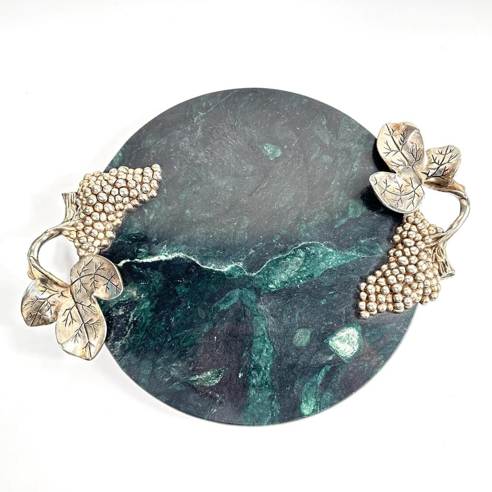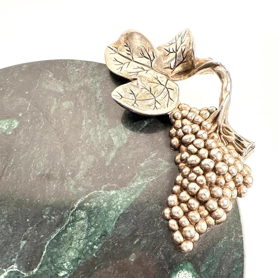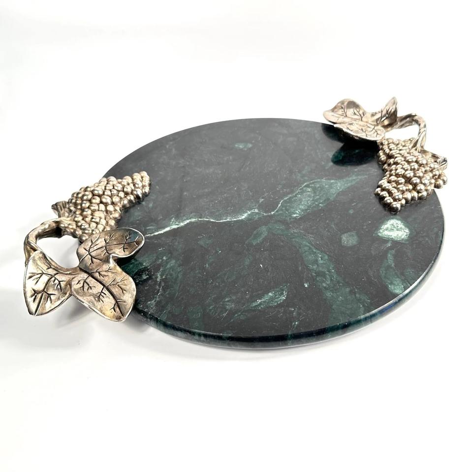 เขียงหินอ่อนสีเขียวทรงกลมหรูหรา พร้อมหูจับรูปองุ่น ตกแต่งด้วยสีเงิน เหมาะสำหรับการรับรองแขก จัดเลี้ยง และเป็นของขวัญ
