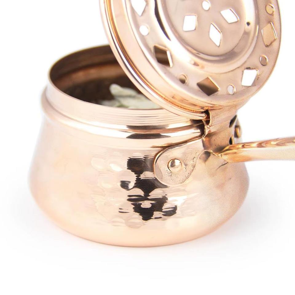 เตาเผาบาคูร์ทองแดงขัดเงาหรูหรา พร้อมด้ามจับยาว ใช้งานง่ายและปลอดภัย เหมาะสำหรับใช้ในวัด ผลิตด้วยมือจากอินเดีย