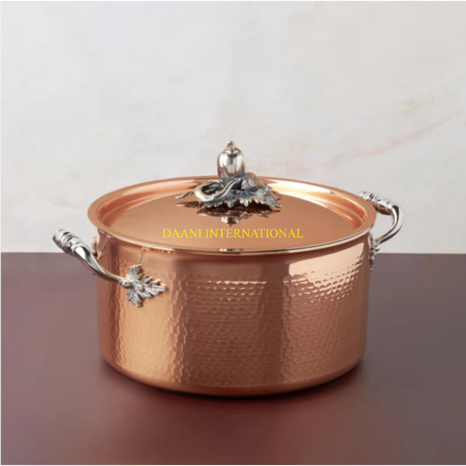 หม้อต้มน้ำทองแดงพร้อมฝาสแตนเลสสุดหรูเครื่องครัวหรูหราพร้อมที่จับตกแต่งและดีไซน์ลูกบิดศิลปะ