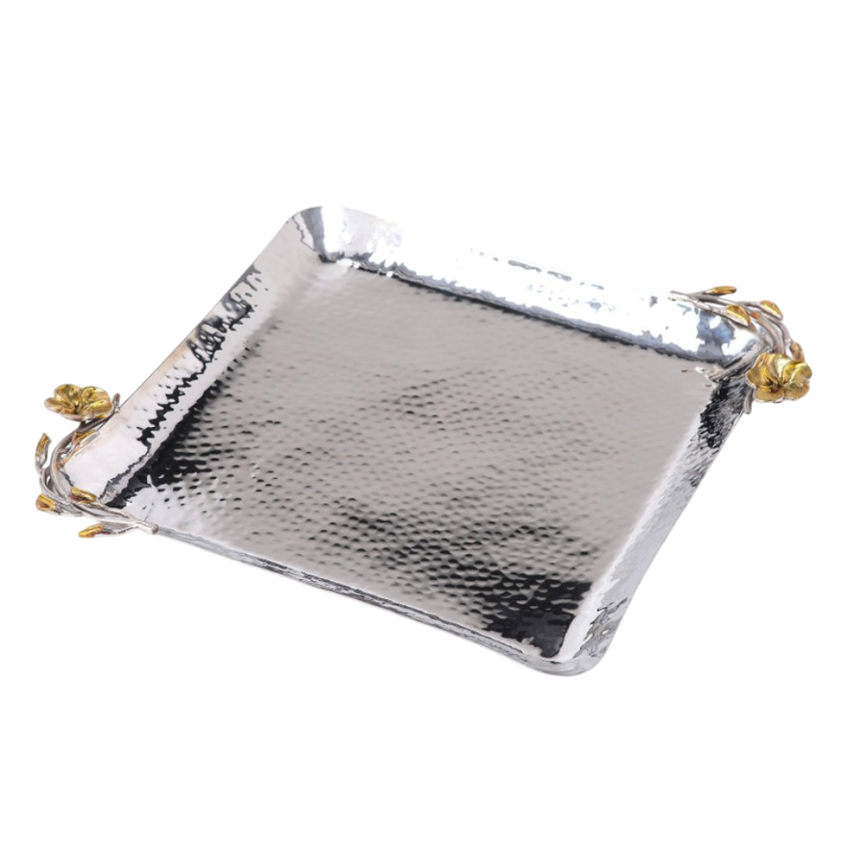 ถาดโลหะทรงสี่เหลี่ยมทำมือสุดหรูพร้อมดีไซน์ใบไม้โบราณถาดเสิร์ฟอาหารทำมือสำหรับจัดเลี้ยง
