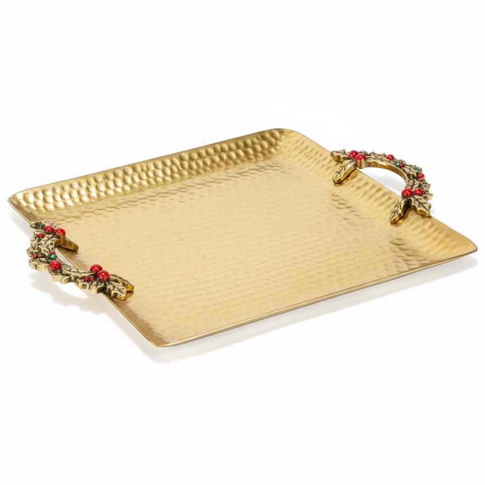 ถาดเสิร์ฟโลหะสีทองลายตอกพร้อมหูจับตกแต่ง ถาดโชว์ชา กาแฟ ถาดของขวัญสุดหรู