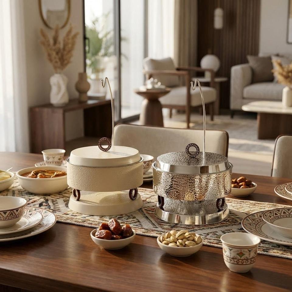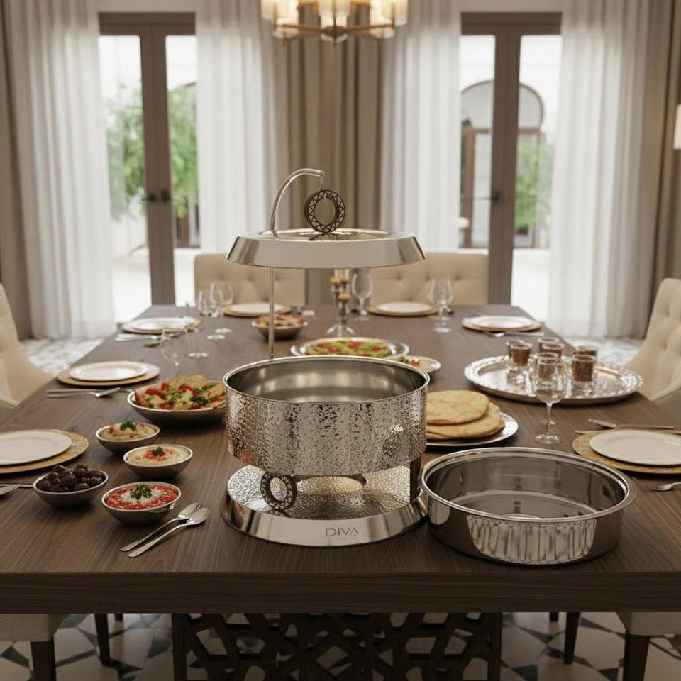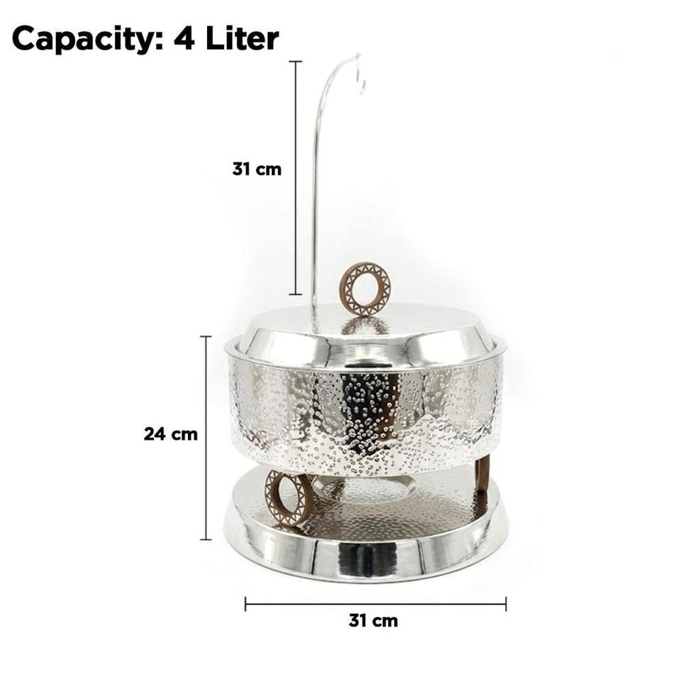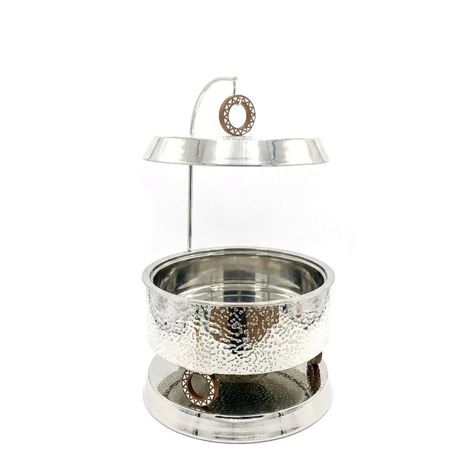 ถาดอุ่นอาหารสแตนเลสแบบตอกลายหรูหรา พร้อมฝาปิดแบบแขวนและตกแต่งด้วยไม้ สำหรับบุฟเฟ่ต์ งานจัดเลี้ยง และงานแต่งงาน