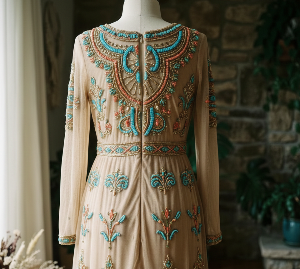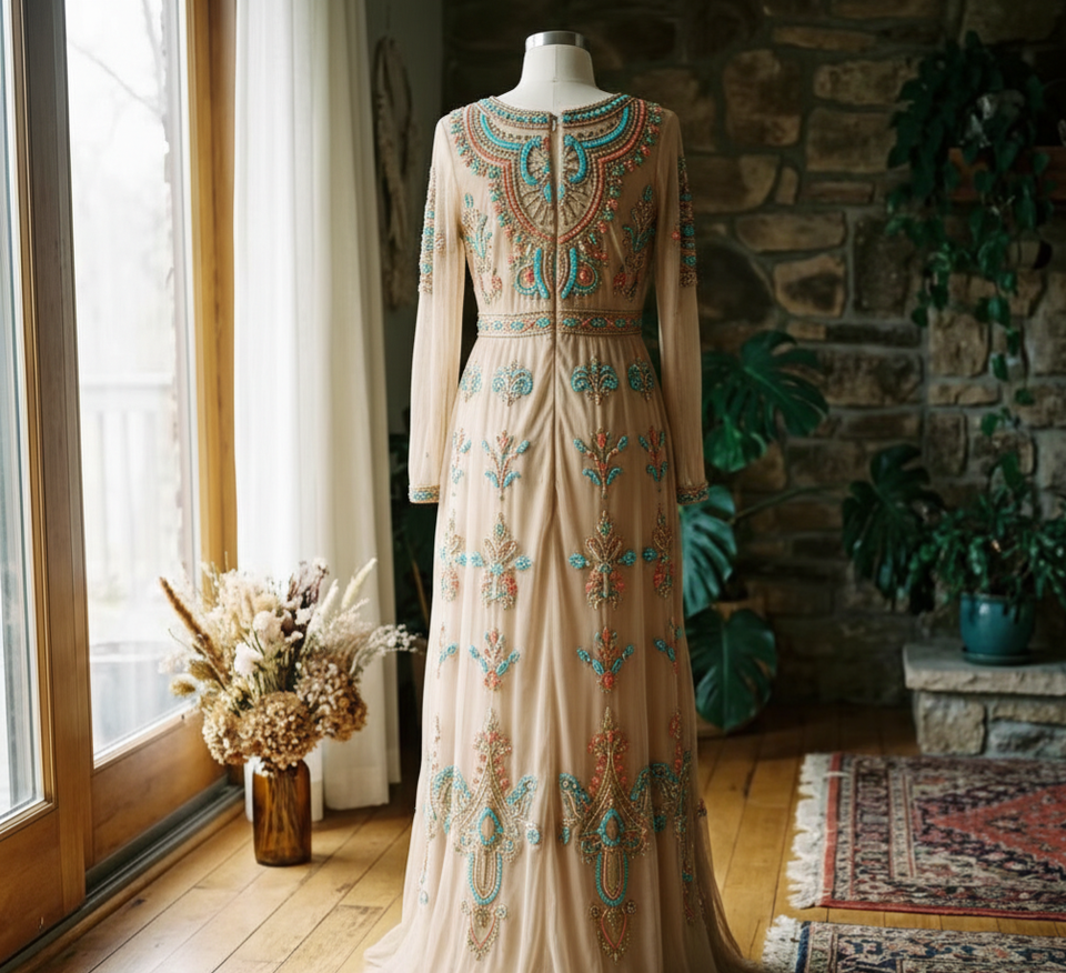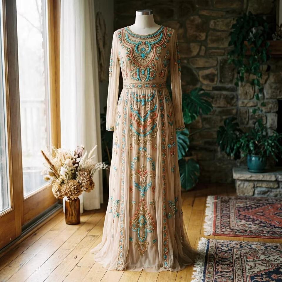 ชุดราตรีหรูหราประดับด้วยลูกปัดทำมือ แขนยาว ปักลายสวยงาม ชุดเดรสยาวแบบเรียบร้อย สั่งตัดได้ สำหรับงานเลี้ยงอย่างเป็นทางการ
