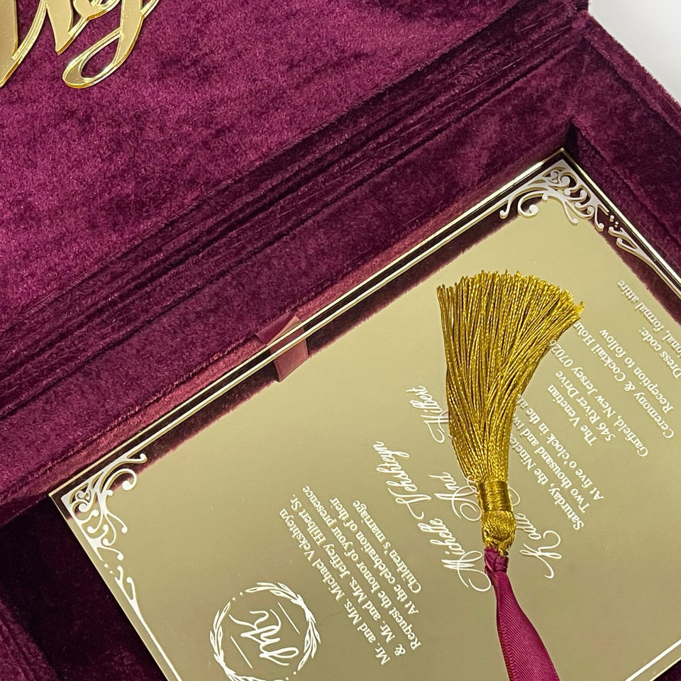Luxury Hand-made Burgundy Velvet Invitation Box - Customizable Packaging by Prestige Creations
