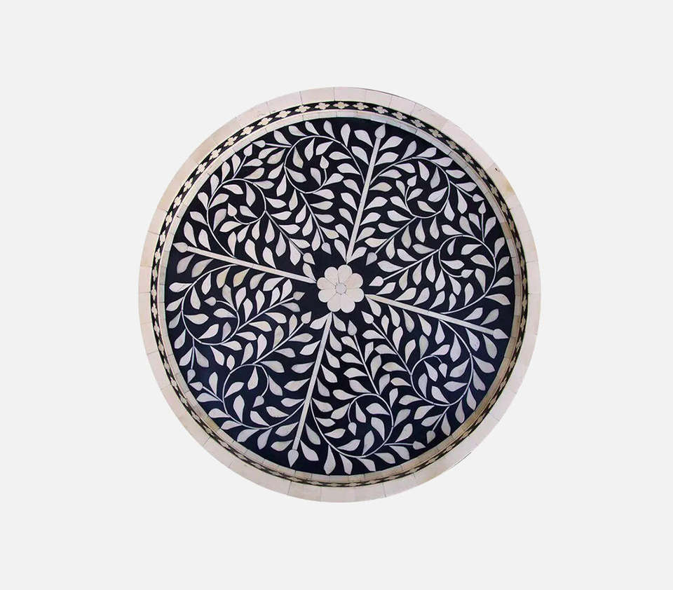 ถาดเสิร์ฟทรงกลมฝังลายกระดูกทำมือสุดหรู พร้อมลวดลายใบไม้ดอกไม้สีดำและสีขาวที่ประณีต ใช้ตกแต่งโต๊ะกาแฟ
