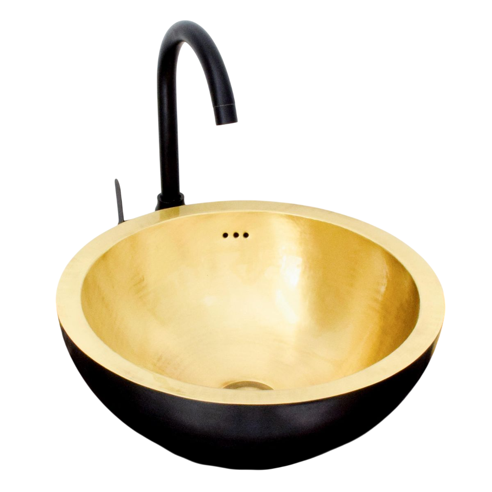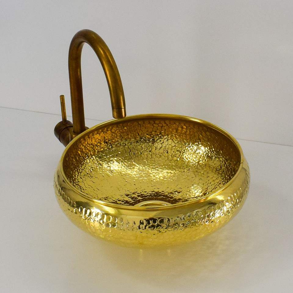 อ่างล้างหน้าทองเหลืองตีลายขอบโค้งมนเคลือบทองคำ งานแฮนด์เมดสุดหรู สำหรับวางบนเคาน์เตอร์ห้องน้ำ ตกแต่งอย่างมีระดับ