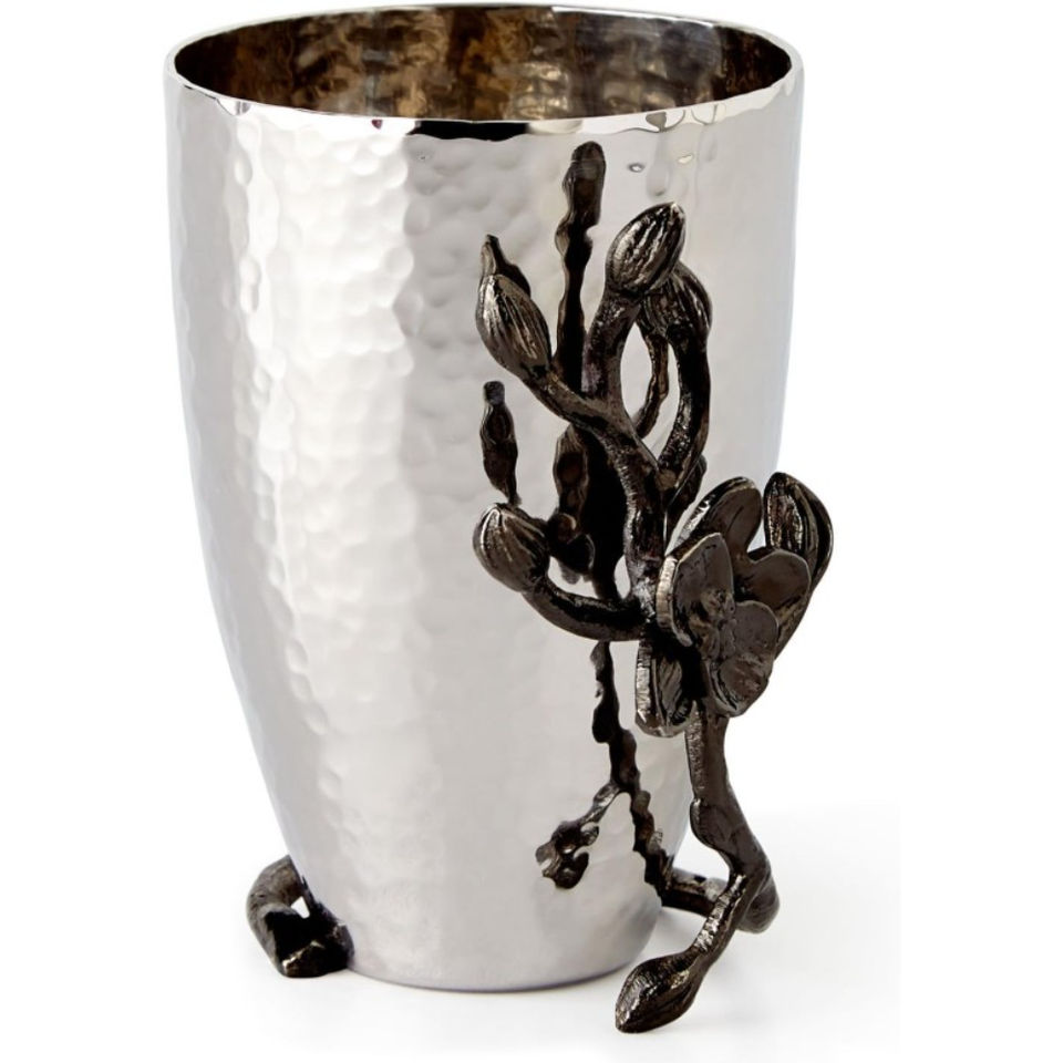 Luxury Handcrafted Metal Flower Vase Silver Hammered Finish With Black Orchid Branch Sculpture Elegant Tabletop Home Decor