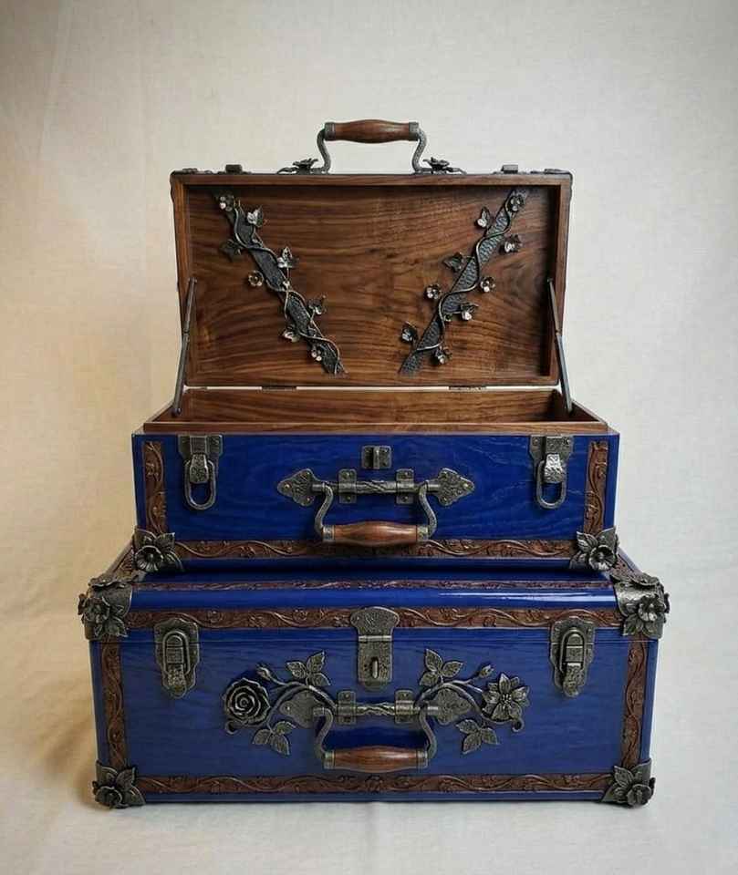 กล่องเก็บของไม้ทำมือสุดหรู พร้อมฮาร์ดแวร์โลหะลายดอกไม้สไตล์โบราณ ตกแต่งสีน้ำเงินวินเทจ