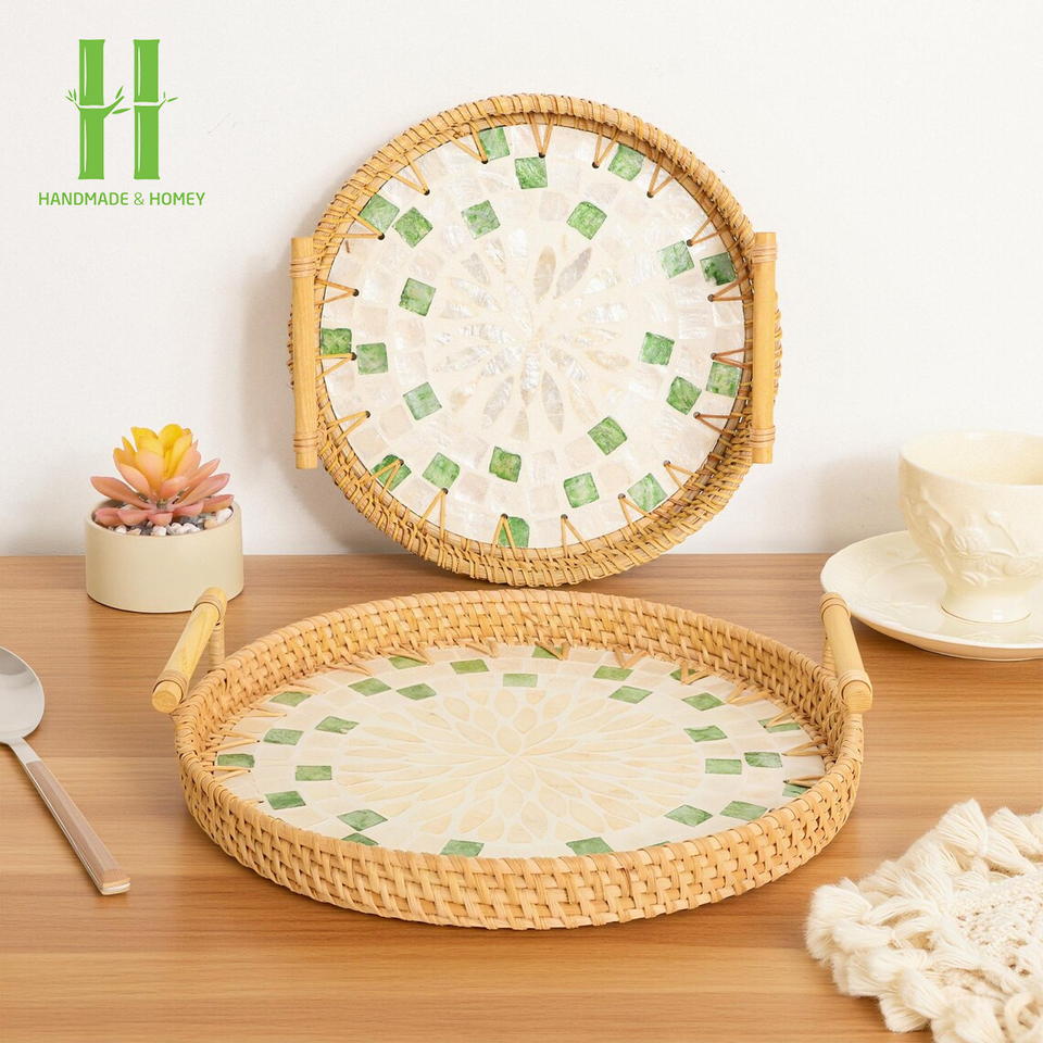 ถาดไม้ไผ่สำหรับเสิร์ฟอาหารเช้าแบบแฮนด์เมดสุดหรูถาดรองเตียงดีไซน์แบบเรียบง่ายพร้อมด้ามจับไม้สำหรับเสิร์ฟอาหาร