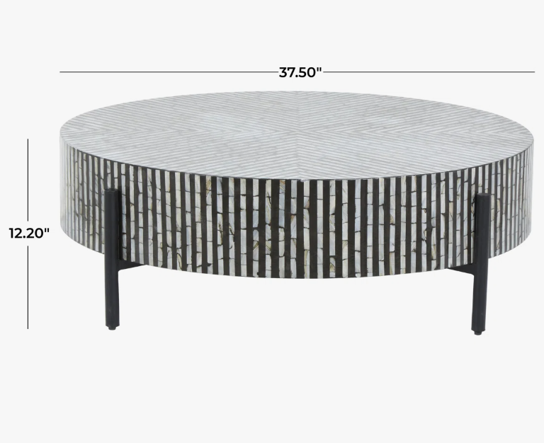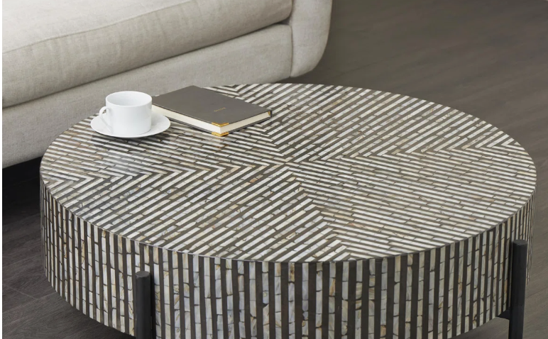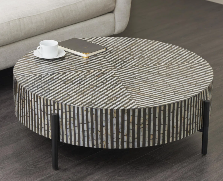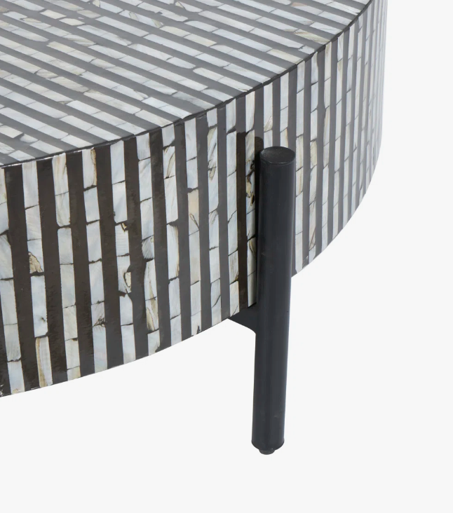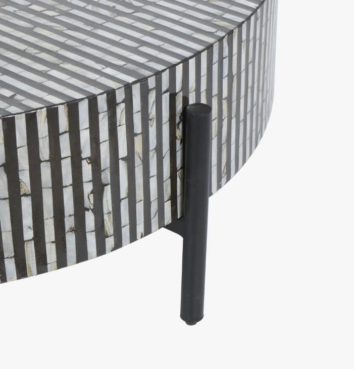 โต๊ะกาแฟโบราณสไตล์โมเดิร์นฝังกระดูกสีดำและสีขาว งานแฮนด์เมดสุดหรู พร้อมฐานโลหะสีดำสำหรับจัดเก็บและตกแต่ง