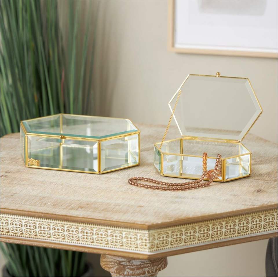 กล่องใส่เครื่องประดับแก้วรูปหัวใจขอบทองเหลืองทำมือสุดหรู กล่องเก็บเครื่องประดับกรอบโลหะสีทองโบราณ กล่องของขวัญดอกไม้แห้ง