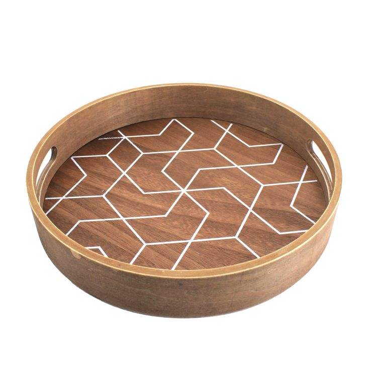 ถาดไม้กลมตกแต่งทำมือสุดหรู พร้อมหูจับ สำหรับเสิร์ฟ วางบนโต๊ะกาแฟ ตกแต่งบ้าน ใส่เครื่องดื่ม อาหาร R10 งานฝีมือ ผลิตในอินเดีย