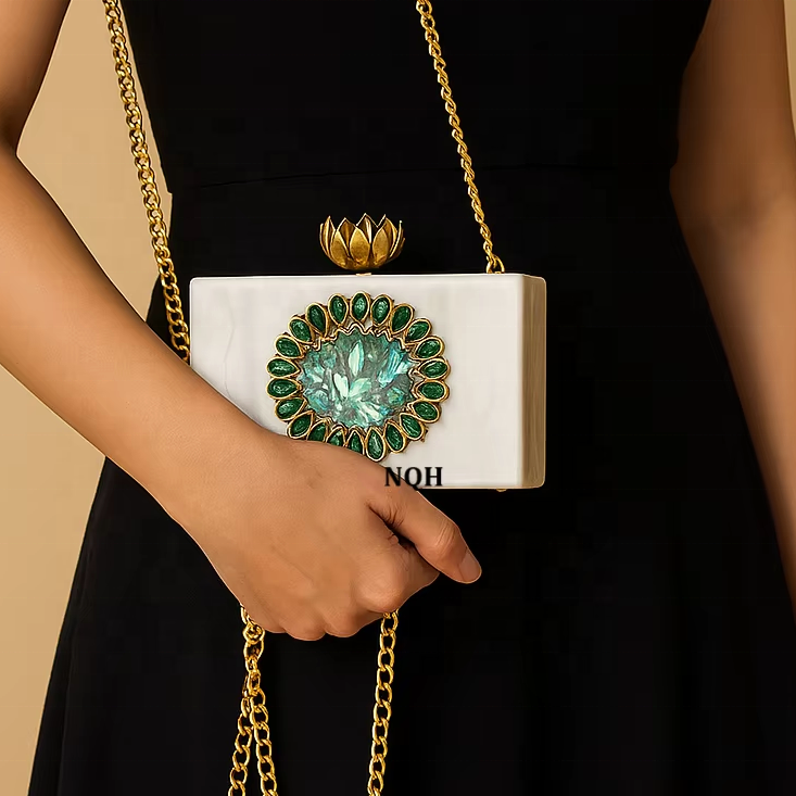 กระเป๋าคลัทช์ไม้เรซิ่นทำมือสุดหรู ทนทาน เป็นมิตรกับสิ่งแวดล้อม ดีไซน์ลายเรขาคณิต พร้อมสายสะพายโซ่ รับทำโลโก้ กระเป๋าสำหรับออกงานกลางคืน