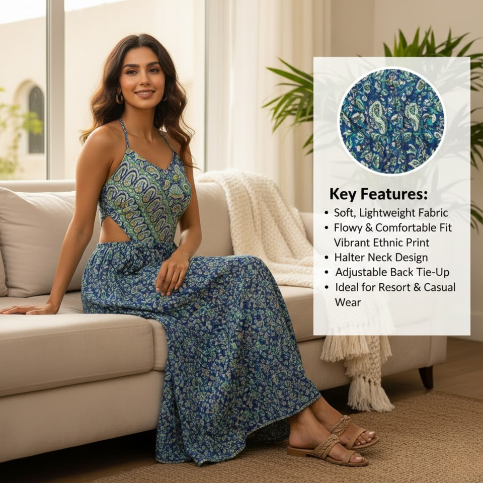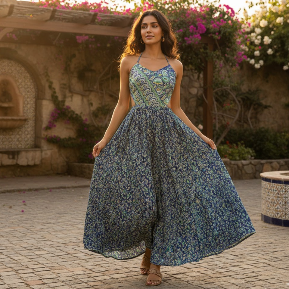 ชุดเดรสยาวผ้าไหมฮาโบไททำมือสุดหรู คุณภาพสูง สายคล้องคอแบบสปาเก็ตตี้ ตัดข้างเว้าหลัง ลายพิมพ์สไตล์ชาติพันธุ์ สำหรับผู้หญิง
