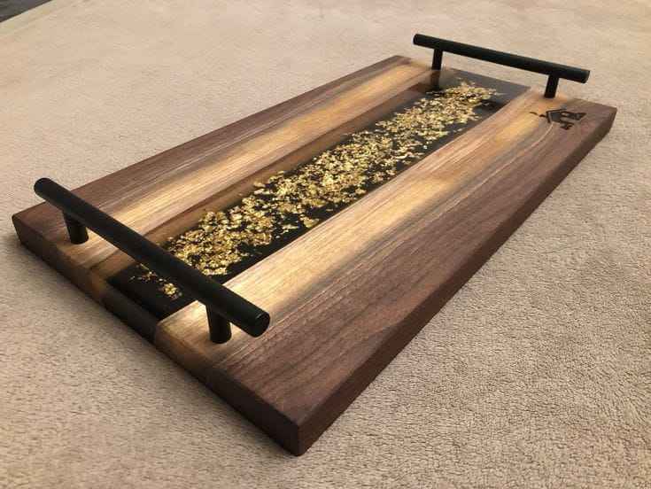 ถาดเสิร์ฟไม้วอลนัทแท้ทำมือสุดหรู ประดับด้วยเรซิ่นอีพ็อกซี่สีอำพัน พร้อมหูจับโลหะสีดำ เหมาะสำหรับเสิร์ฟชาร์กูเตอรี ใช้ในโรงแรมและร้านอาหาร