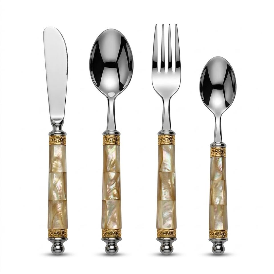 ชุดช้อนส้อมสแตนเลสสตีลทำมือสุดหรู ด้ามจับประดับมุก สำหรับใช้ในบ้านและร้านอาหาร