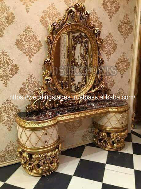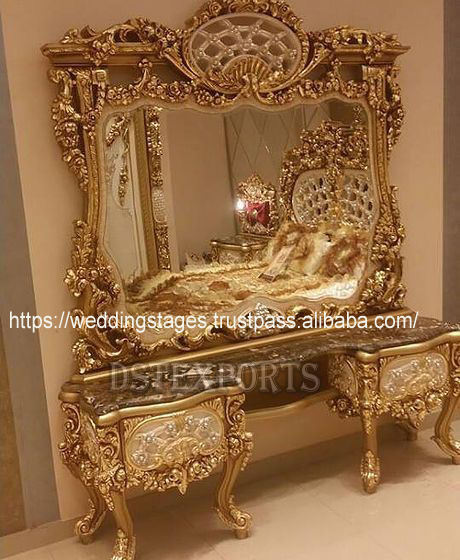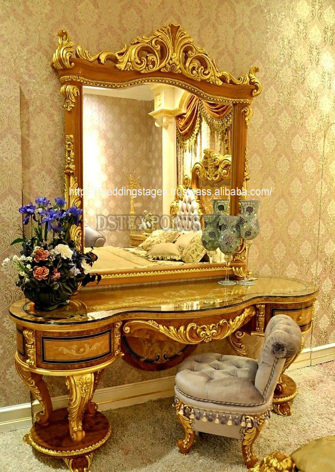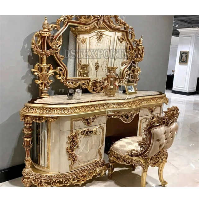 โต๊ะเครื่องแป้งทำจากไม้แกะสลักอย่างหรูหราพร้อมกระจกชุดเฟอร์นิเจอร์เก้าอี้ไม้สักตกแต่งสีทองพรีเมียม