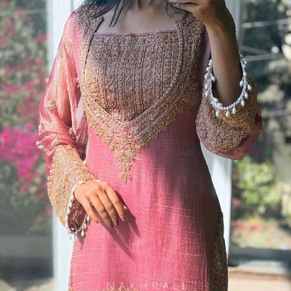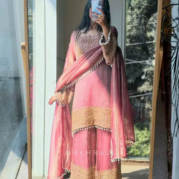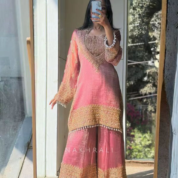 ชุดคุรตะปาลาซโซ่หรูหราทรงปกติ แห้งเร็ว ใส่ได้ทุกฤดู ตกแต่งด้วยการปักลายทันสมัย ขนาด 5 มม. สำหรับผู้หญิง - เหมาะสำหรับงานปาร์ตี้ งานดิวาลี และงานแต่งงาน